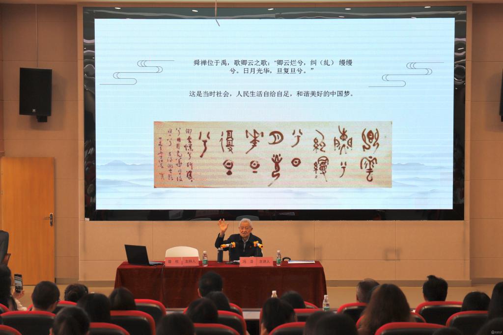 冯泽教授已91岁高龄,但他仍然以饱满的精神面貌,从古代中国梦、近代中国梦、现代中国梦三个方面,将传统诗词作品中蕴含的中国梦娓娓道来,勾勒出从古至今中华民族对中国梦的追求,为参会的全体师生带来对于中国梦的全新解读。冯泽教授说,中华民族上下5000年,各个历史时期的人民用诗歌表达中国梦的愿景,是一以贯之的,总的来说,都是在追求“国家富强、民族振兴、人民幸福”。讲座过程中,冯泽教授博古通今、睿智深刻、出语雅致、言近意远,无不体现出浓郁的家国情怀和心怀天下的胸襟,同时,冯泽教授也对现场参会的师生们提出要在诗词中感受、探寻现代中国梦,传承中国精神,建设美好中国的殷切希望。