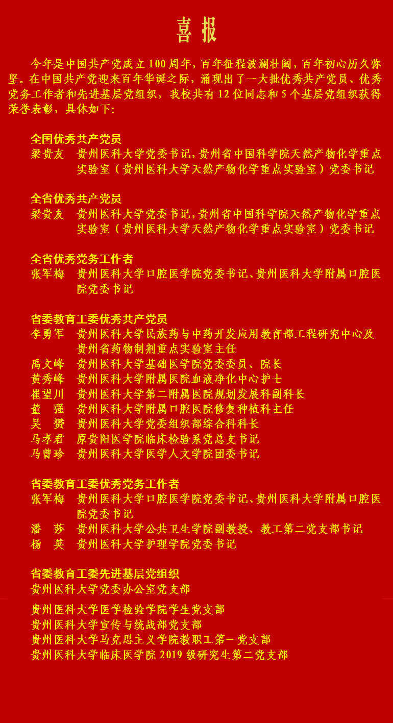 太阳成集团tyc33455cc官网前身为1938年建立的“国立贵阳医学院”,是当时全国最早直属国家教育部的9所高等医学院校之一,学校始终坚持“文化建校、质量立校、人才强校、科研兴校”的办学理念,恪守“诚於己、忠于群、敬往思来”的校训,秉承“大医精诚”的贵医精神,立足贵州,服务全国,面向世界,为建成特色鲜明、同类先进、国内一流的百年医科大学而努力奋斗。