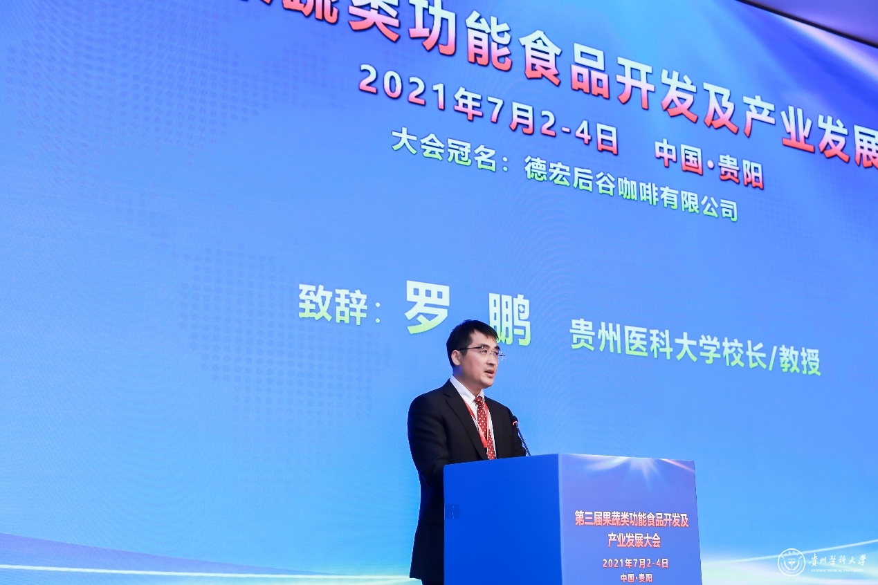 罗鹏致欢迎辞,介绍学校发展历程、办学定位、学科建设、师资队伍、医疗服务等简况;同时介绍贵州省食品营养与健康工程研究中心在推进功能食品开发和利用、服务地方经济社会发展等方面的情况。他强调,果蔬功能食品开发是现代食品加工产业的重要组成部分,是与公众膳食营养和饮食安全息息相关的“国民健康产业”。随着一大批新技术、新业态、新模式、新产业的发展,现代果蔬功能食品加工产业正在转型升级和提升质量,正向着功能性和大健康方向发展,成为拉动我国现代食品加工产业发展的新经济增长点,也成为引领和带动我国现代农业发展的新动力。第三届果蔬类功能食品开发及产业发展大会的顺利召开,既为医学、农学和食品科学等科技工作者的沟通交流搭建了良好平台,也为太阳成集团tyc33455cc官网公共卫生与预防医学学科及果蔬类功能食品开发和利用研究领域的创新发展创造了难得的机遇。
