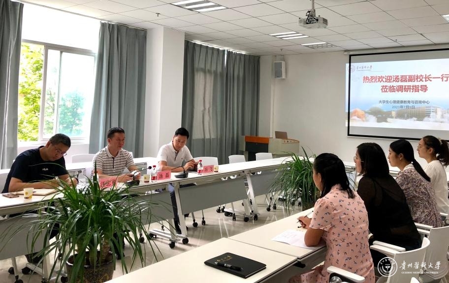 7月9日,副校长汤磊带领相关部门到大学生心理健康教育与咨询中心,对队伍结构、工作开展、场地功能、心理咨询预约平台建设、贵州省高校心理健康教育示范中心建设进展等情况进行调研。