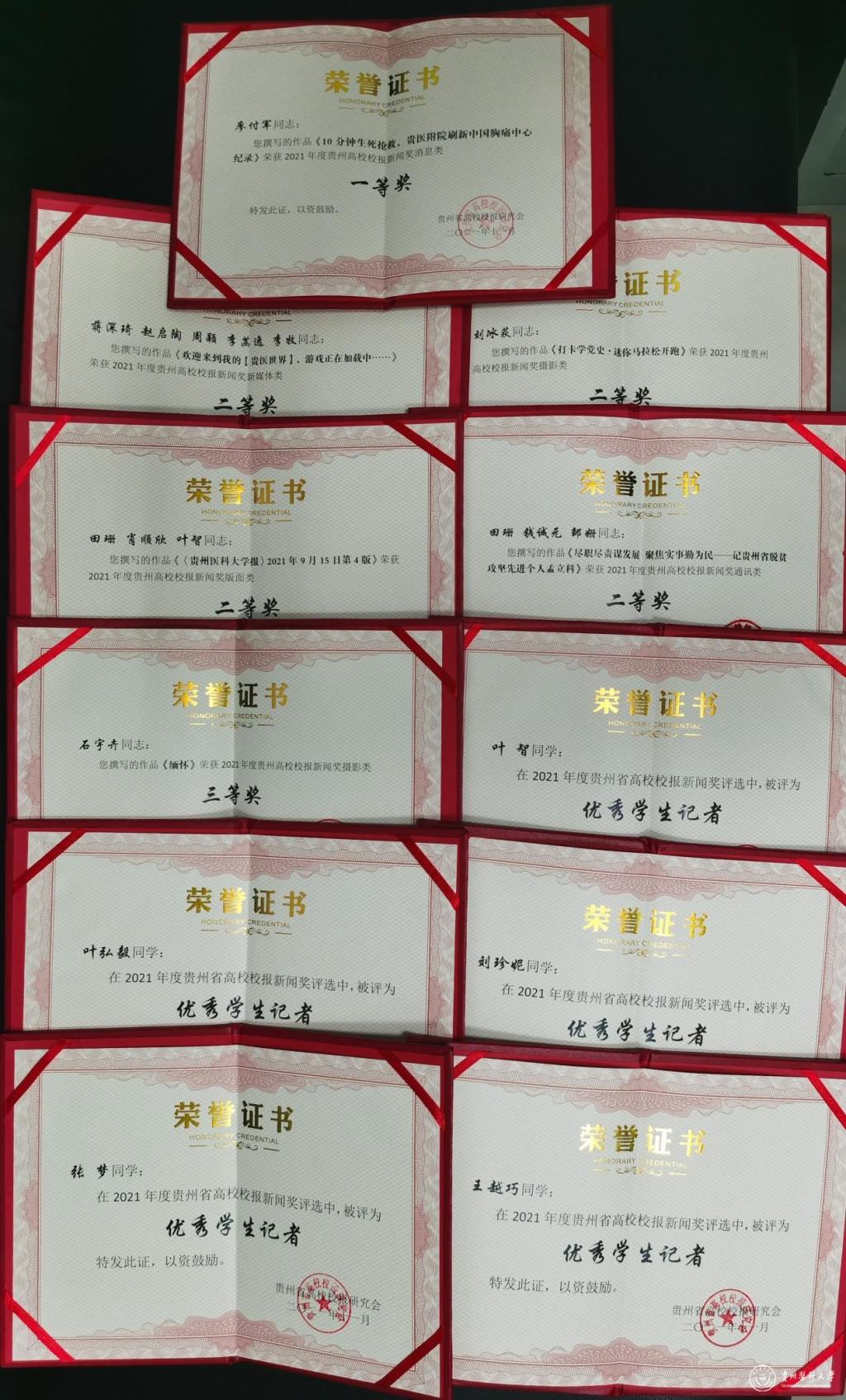 会议表彰了2021年度贵州省高校校报新闻评选获奖作品和个人,太阳成校报作品共获12个奖次,其中一等奖1项,二等奖4项,三等奖1项,优秀编辑1人,优秀学生记者5名。廖付军《10 分钟生死抢救,贵医附院刷新中国胸痛中心纪录》获消息类一等奖;刘冰荻《打卡学党史·迷你马拉松开跑》获新闻摄影类二等奖,田珊、钱诚元、邹姗江《尽职尽责谋发展 聚焦实事勤为民——记贵州省脱贫 攻坚先进个人孟立科》获通讯类二等奖,田珊、肖顺欣、叶智《太阳成集团tyc33455cc官网报》2021年9月15日第4版获版面类二等奖,蒋深琦、赵启陶、周颖、李菡逸、李牧《欢迎来到我的【贵医世界】,游戏正在加载中……》;石宇卉《缅怀》获新闻摄影类三等奖。田珊获评“优秀编辑”称号,刘珍妮、叶智、叶弘毅、张梦、王越巧获评“优秀学生记者”称号。