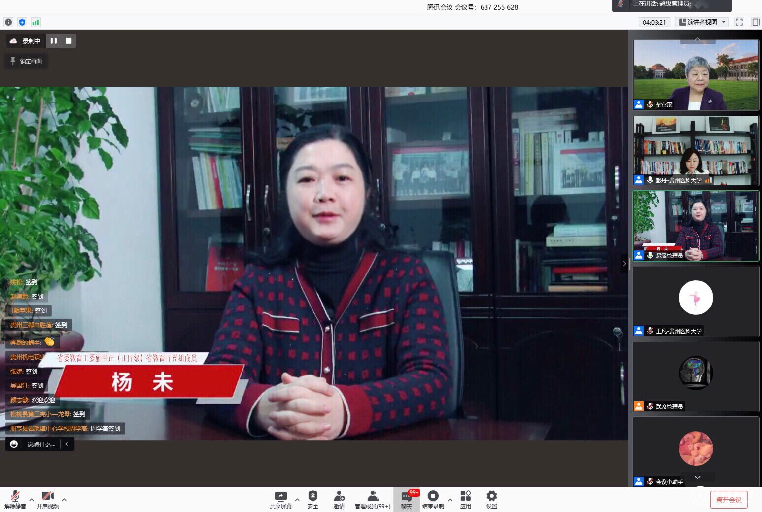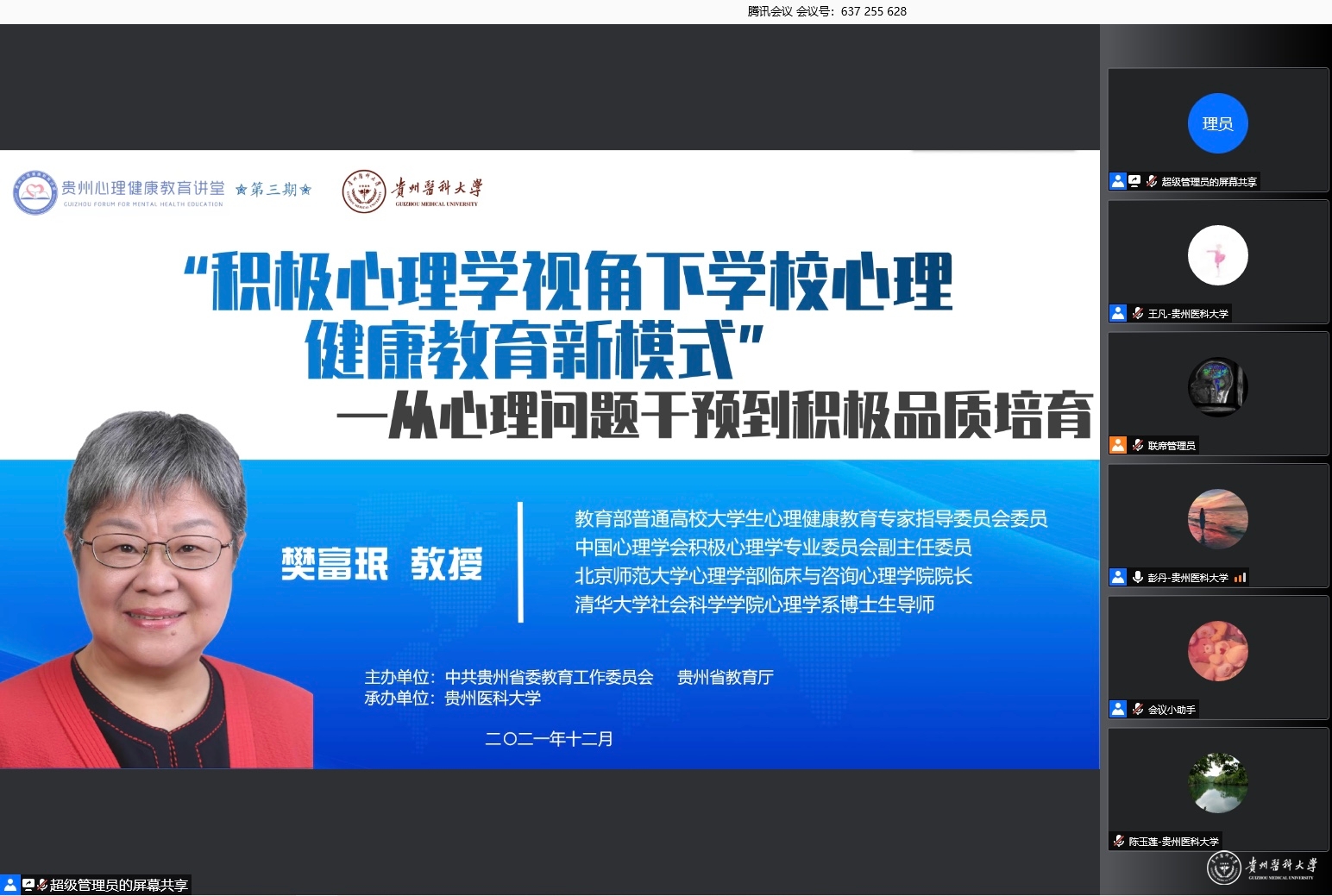 12月13日,第三期贵州心理健康教育讲堂在线举行。本期讲座由省委教育工委、省教育厅主办,太阳成集团tyc33455cc官网承办。省委教育工委副书记(正厅级)、教育厅党组成员杨未出席并讲话,太阳成党委副书记汤磊出席并致辞,全国知名心理专家樊富珉教授为全省2000余名大中小学心理健康教育教师、高校辅导员、中小学班主任、心理健康教育工作管理人员做专题讲座。大学生心理咨询与教育中心副主任彭丹主持讲座。