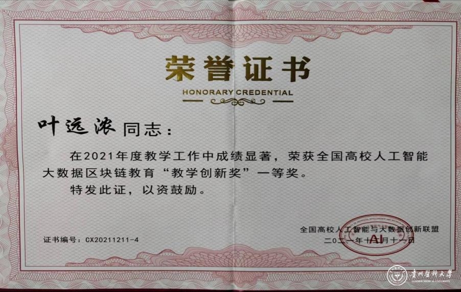 12月11日,由教育部中国教育发展战略学会、科技部科技人才交流开发服务中心指导,全国高校人工智能与大数据创新联盟主办、电子科技大学、佛山市人工智能学会、黑龙江省高等教育学会人工智能教育专业委员会等26家单位和机构协办的“2021第四届全国高校人工智能大数据区块链创新论坛”在北京召开。在会议现场,全国高校人工智能与大数据创新联盟向来自全国52位教师24所高校代表颁发了人工智能大数据区块链教育教学“创新奖”。太阳成集团tyc33455cc官网获“2021年度大数据专业(方向)最具发展潜力和创新力高校奖”一等奖。大健康学院副院长叶远浓获“全国高校人工智能大数据区块链‘教学创新奖’”一等奖。