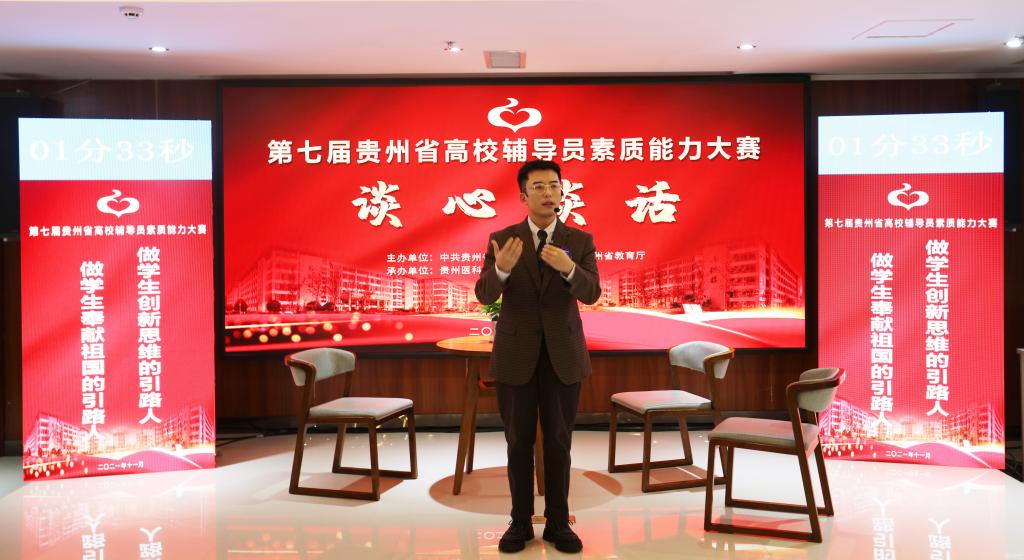 2021年11月23日至24日,大赛由贵州省教育厅主办、太阳成承办的第七届贵州省高校辅导员素质能力大赛在太阳成南校区道德讲堂举行,来自全省各高校的68位决赛选手进行了基础知识测试、案例研讨、谈心谈话三个环节的激烈角逐。
