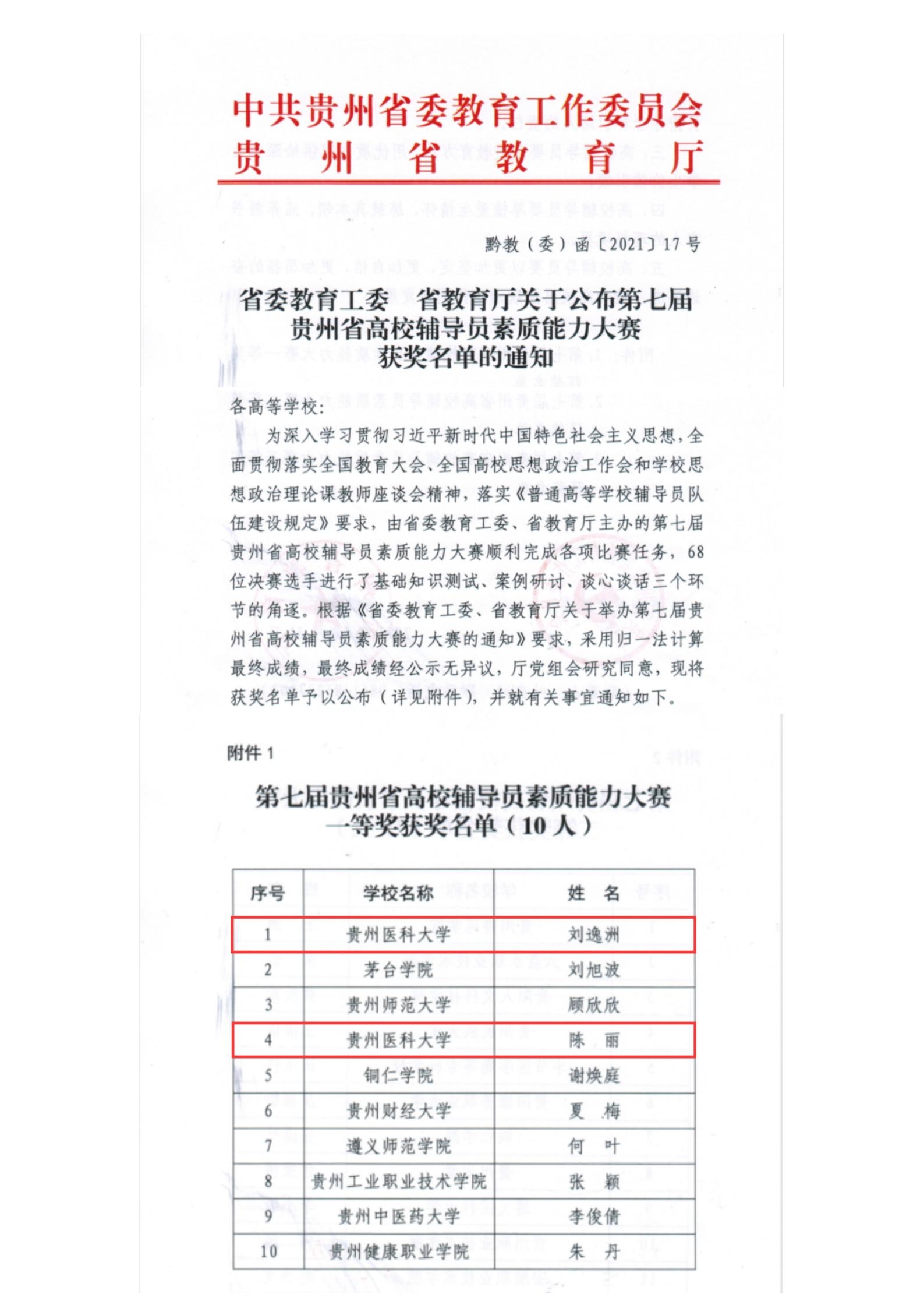 近日,在省教育厅公布的第七届全省高校辅导员素质能力大赛,太阳成口腔医学院辅导员刘逸洲、影像学院辅导员陈丽凭借扎实的理论功底、过硬的专业素养,以优异表现分别获一等奖第一名、第四名。