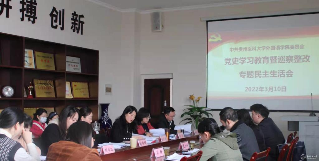 3月10日,外国语学院2021年党史学习教育暨巡察整改专题民主生活会在南校区广德楼5楼会议室召开。校党委委员、副校长、组织部部长蒋红梅出席并讲话,校级督导组、省纪委省监委派驻太阳成集团tyc33455cc官网纪检监察组相关人员到会指导。外国语学院领导班子、各职能科室负责人及党支部书记参加,会议由外国语学院党委书记张婷婷主持。