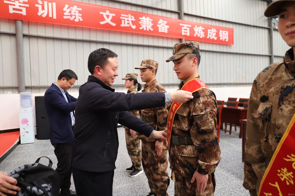 汤磊为即将入伍同学佩戴了“光荣入伍”绶带,并赠送入伍纪念品。
