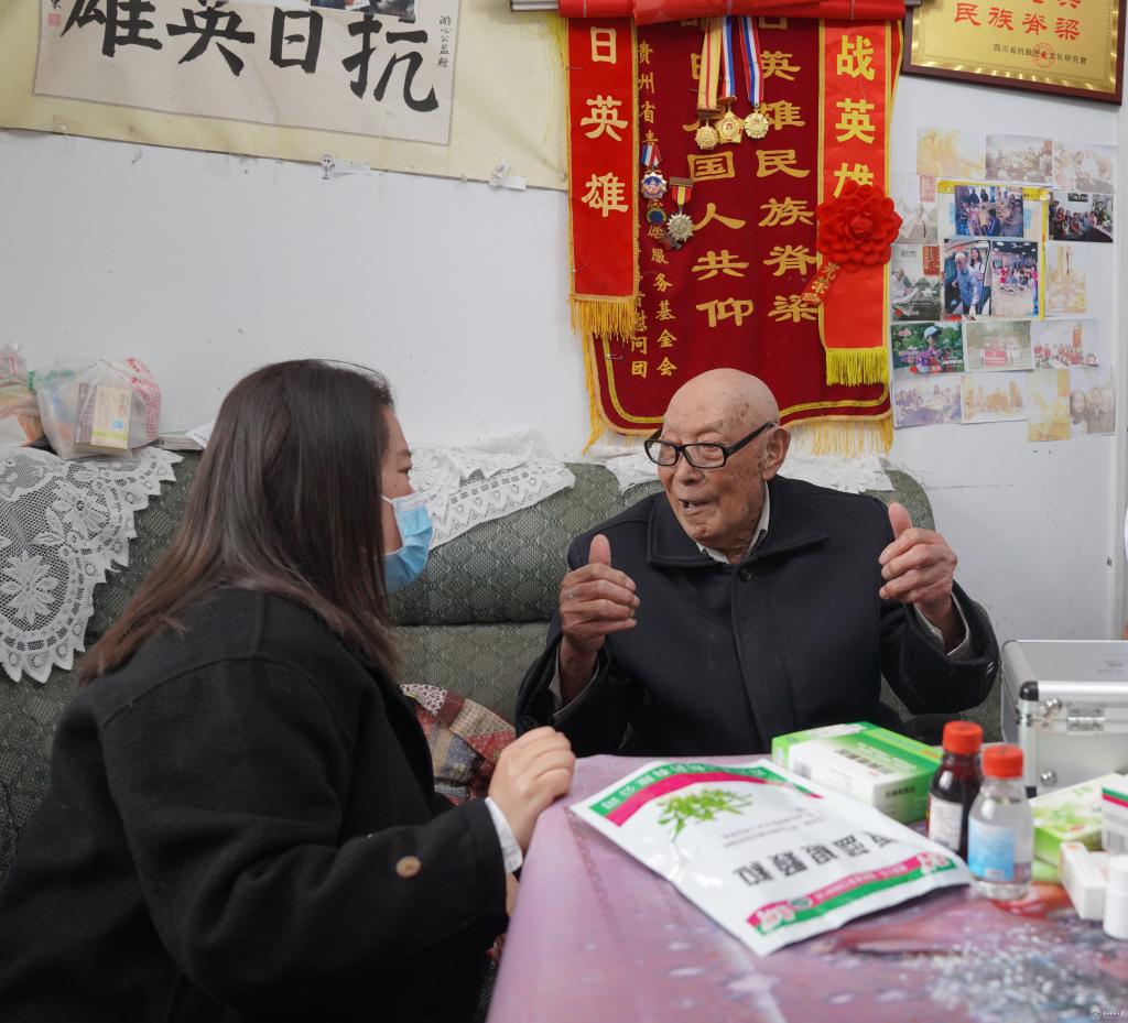 在义诊过程中,眼科与皮肤科的专家了解到小区有位109岁高龄的独居老人常年受眼疾与皮肤疾病困扰,步行穿过几个街区到老人家中进行诊疗。老人原是参加过抗日战争的老战士、老英雄,所患疾病亦是当年在战场上受伤所致。两位专家仔细为老人诊治后,赠送相应的药品,向照顾老人的志愿者给出了用药建议及日常照顾时需要注意的事项。老人对专家们的到来表示感谢,向所有人双手竖起了大拇指。