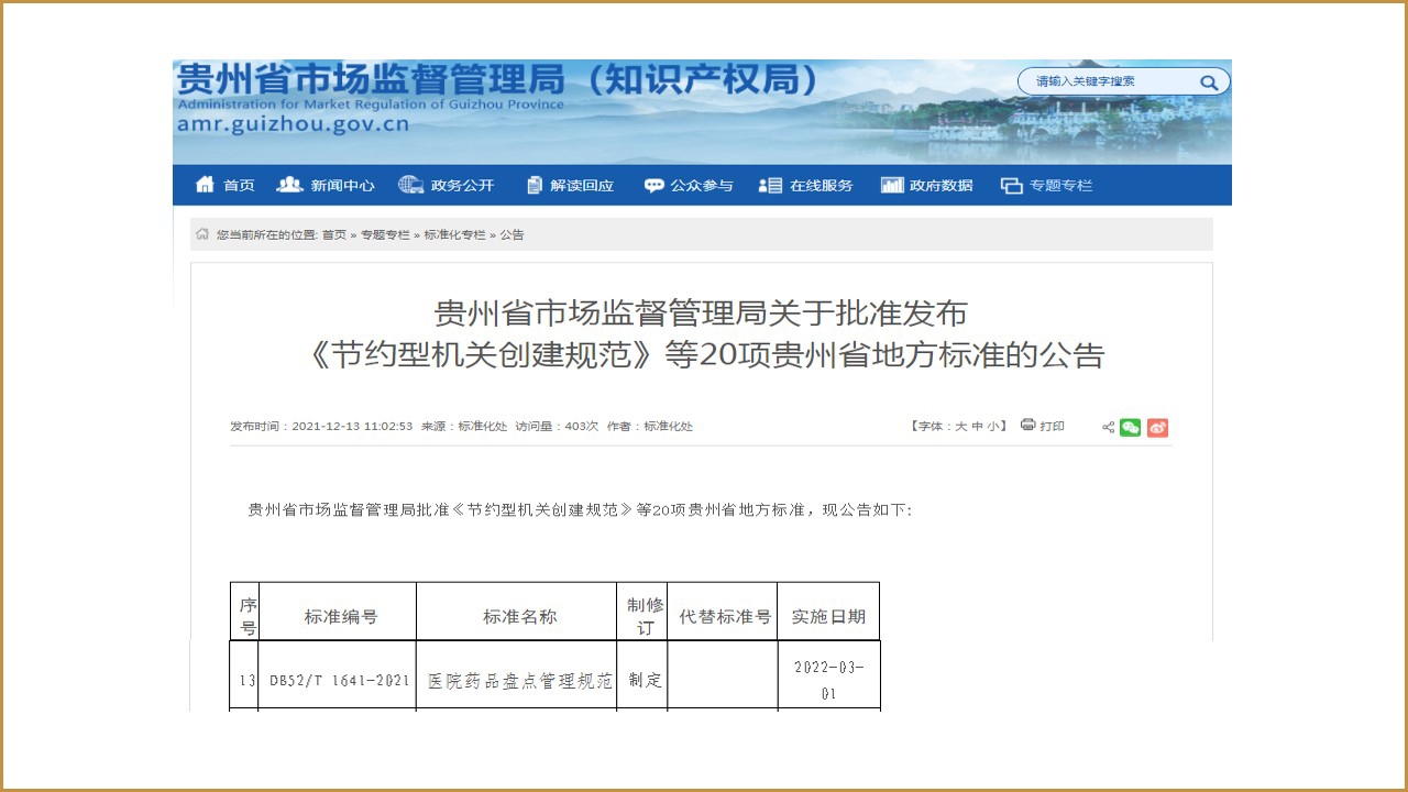 近日,由太阳成附属口腔医院牵头编制的贵州省首个医院药学地方标准《医院药品盘点管理规范》(标准编号DB52/T 1641-2021)获贵州省市场监督管理局批准正式发布实施。