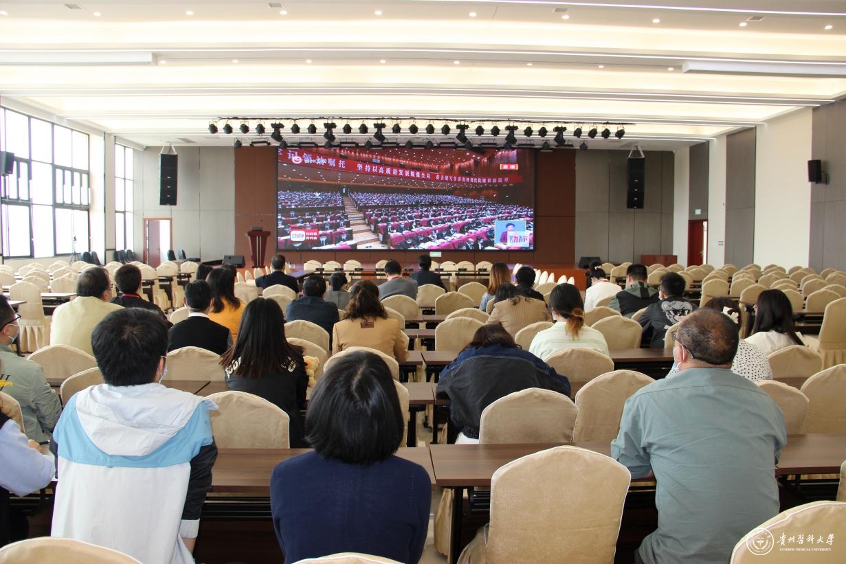 谌贻琴在报告中指出,中国共产党贵州省第十三次代表大会,是在党的二十大即将召开,我省如期打赢脱贫攻坚战,如期全面建成小康社会,开启全面建设社会主义现代化国家新征程的关键时期召开的一次十分重要的大会。大会的主题是:高举习近平新时代中国特色社会主义思想伟大旗帜,牢记习近平总书记殷切嘱托,坚持以高质量发展统揽全局,围绕“四新”主攻“四化”,奋力谱写多彩贵州现代化建设新篇章。贵州省第十三次党代会的召开,又一次激发了全校教职员工感党恩、听党话、跟党走的巨大热情。