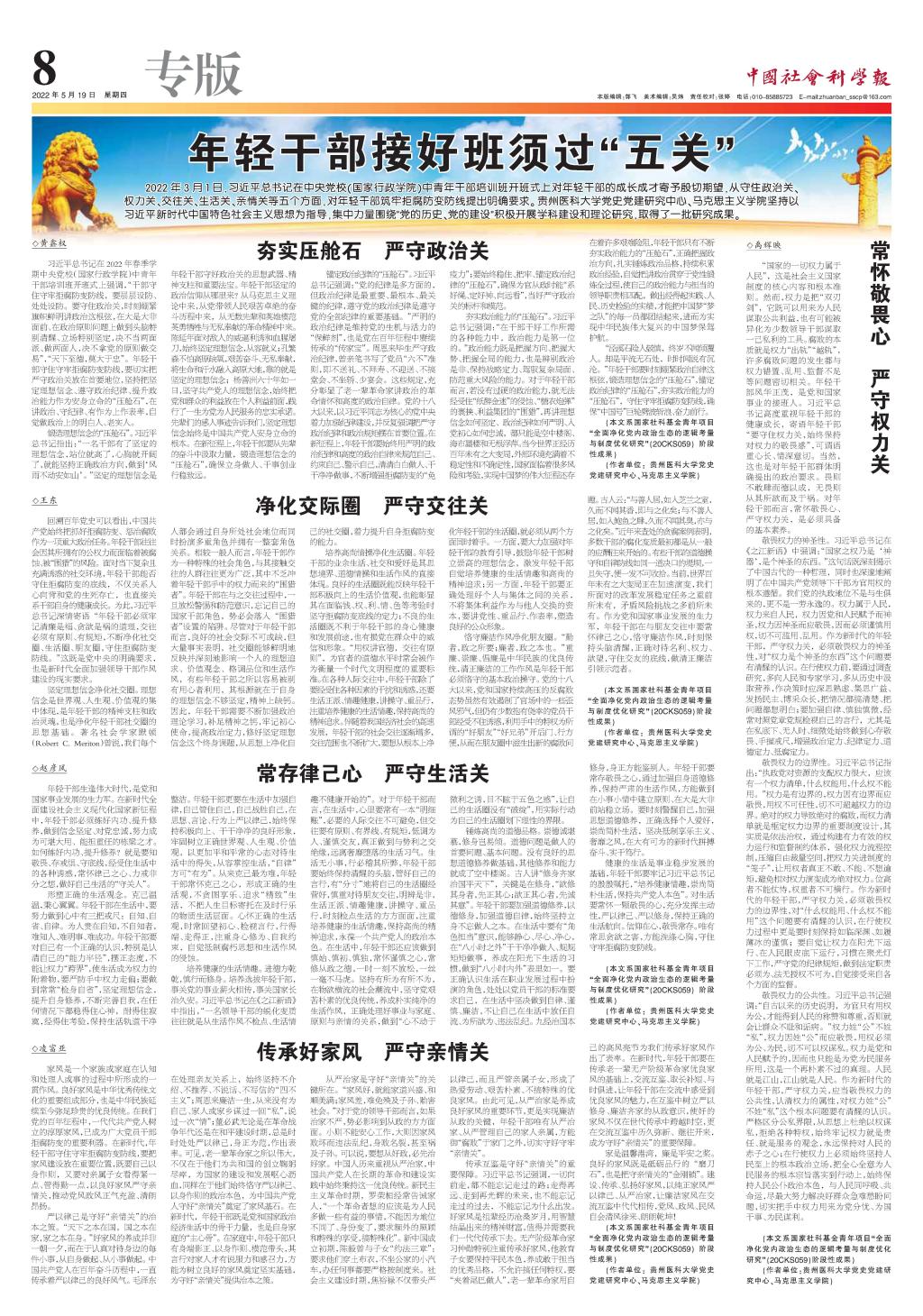 太阳成党史党建研究中心、马克思主义学院深入学习贯彻习近平总书记系列重要讲话精神,坚持以习近平新时代中国特色社会主义思想为指导,集中力量围绕“年轻干部接好班须过‘五关’”展开理论研究,取得了一系列研究成果。5月19日,《中国社会科学报》第8版整版刊登,包括黄鑫权的《夯实压舱石 严守政治关》、禹辉映的《常怀敬畏心 严守权力关》、王东的《净化交际圈 严守交往关》、赵彦风的《常存律己心 严守生活关》、凌富亚的《传承好家风 严守亲情关》。