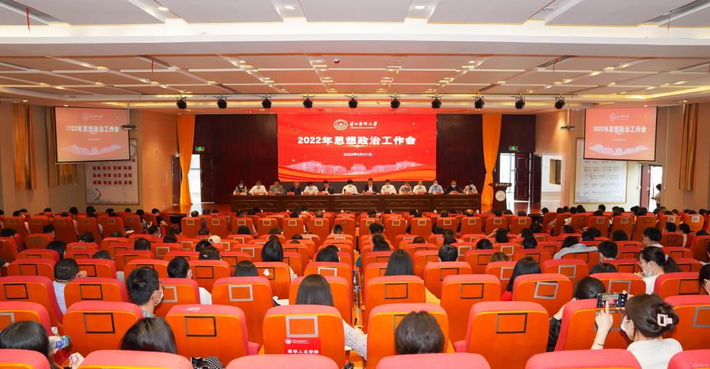 会议指出,近年来,学校围绕立德树人根本任务,构建了党委统一领导、党政齐抓共管、党委宣传部牵头协调、各部门各负其责、师生员工积极参与的“大思政”格局。形成了有特色的“红色思政课”,有温度的“抗疫思政课”等思政工作亮点。在课程、科研、实践、文化、网络、心理、管理、服务、资助、组织育人方面积累了好经验,取得了好成绩。2022年是党的二十大和省第十三次党代会召开之年,也是学校全面加快高质量发展的奋进之年。大事多、重要节点多,学校要紧密团结在以习近平同志为核心的党中央周围,深入学习贯彻习近平总书记视察贵州重要讲话精神、关于教育重要论述精神,贯彻落实省第十三次党代会精神,坚持立德树人根本任务,立足“两个大局”,心怀“国之大者”,坚持“高站位、宽视野、大格局”,聚焦迎接学习贯彻党的二十大这条贯穿全年工作的主线,深入学习贯彻省第十三次党代会精神,按照“质量党建、精准思政、积极维稳、系统推进”的总体思路,全面推动学校思想政治工作高质量发展。
