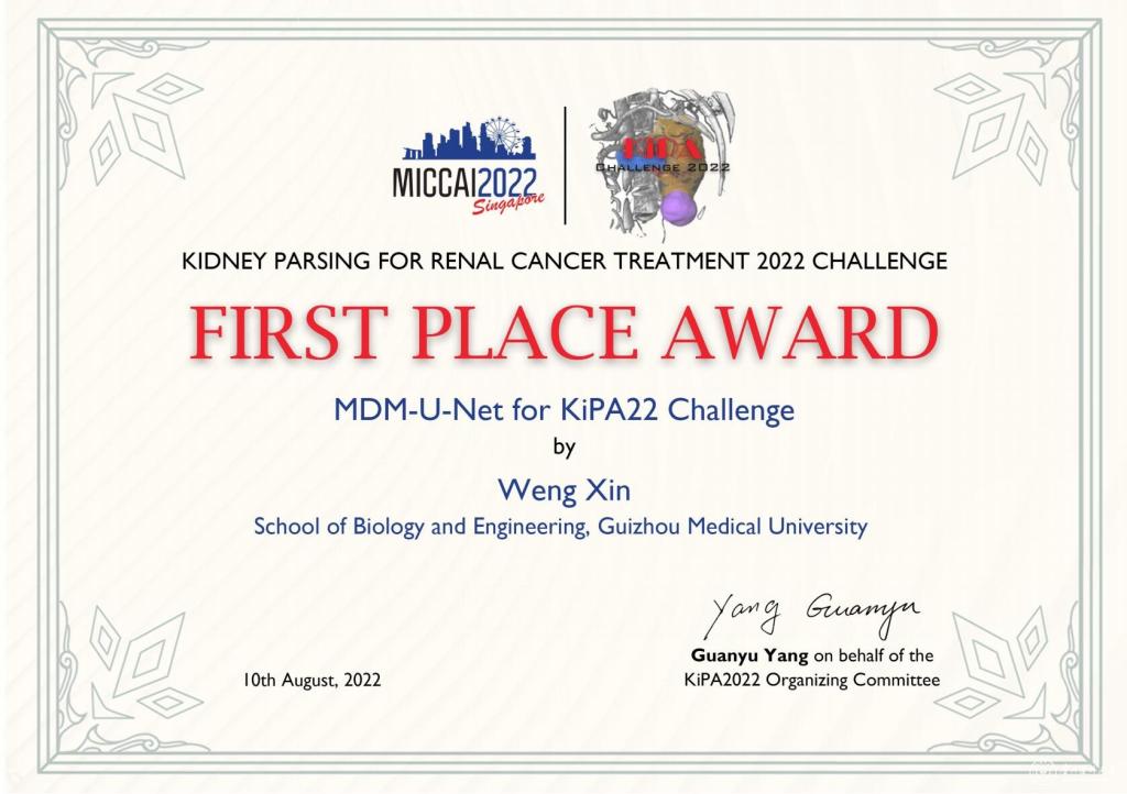 近日,太阳成集团tyc33455cc官网生物与工程学院(健康医药现代产业学院)杨帆、雷平贵、胡祖权老师团队的研究生翁鑫在2022年国际医学影像领域顶会MICCAI(Medical Image Computing and Computer Assisted Intervention)的肾癌分析挑战赛(Kidney PArsing Challenge 2022,KiPA22)中荣获比赛冠军,并受邀做汇报。