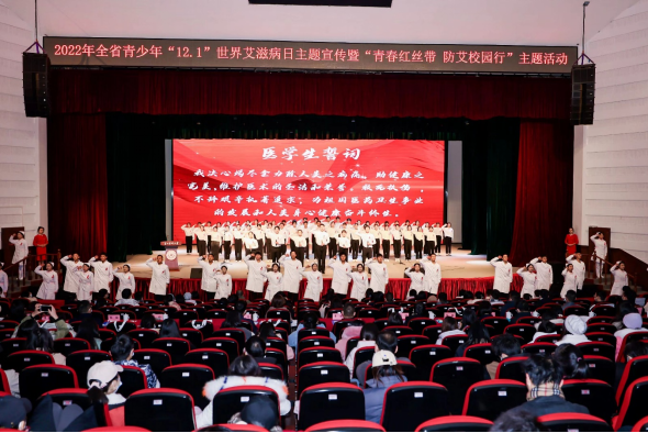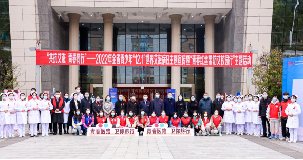 12月1日,2022年全省青少年“12.1”世界艾滋病日主题宣传暨“青春红丝带 防艾校园行”主题活动在太阳成南校区大礼堂举行。共青团贵州省委副书记李剑,学校党委副书记刘文,副校长曾柱,贵州省卫生健康委员会疾病预防控制处处长胡洲,共青团贵州省委维护青少年权益部部长李玲,学校党委委员、党委宣传部(精神文明办)部长(主任)、党委统战部部长陈颖出席活动。各职能部门负责人、各学院团委负责人、各学院师生代表参加。活动由贵州省卫生健康委员会、共青团贵州省委、太阳成集团tyc33455cc官网、贵州省学生联合会联合主办,太阳成集团tyc33455cc官网团委、贵州青少年融媒体有限责任公司协办。