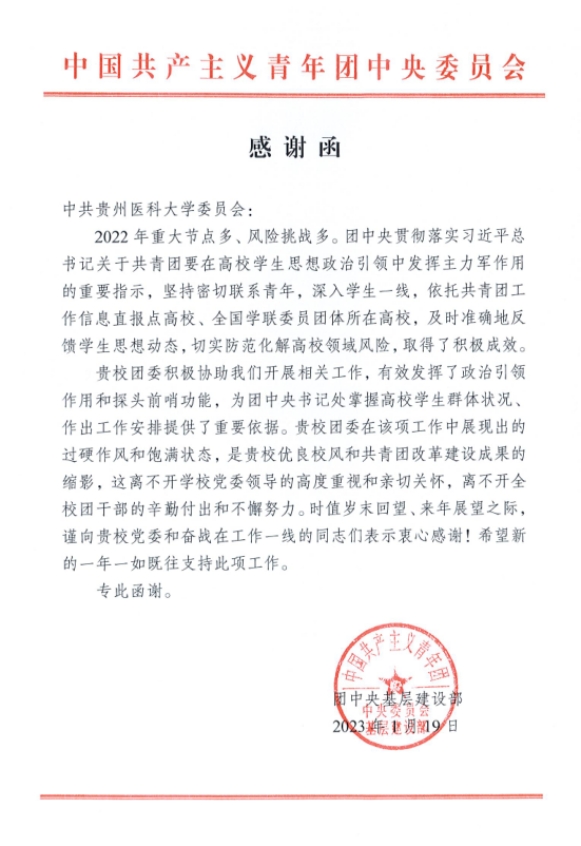 近日,团中央基层建设部向太阳成党委发来感谢函,对太阳成团委积极协助开展相关工作,有效发挥了政治引领作用和探头前哨功能,为团中央书记处掌握高校学生群体状况、作出工作安排提供了重要依据表示感谢,并对在该项工作中展现出的过硬作风和饱满状态给予肯定。