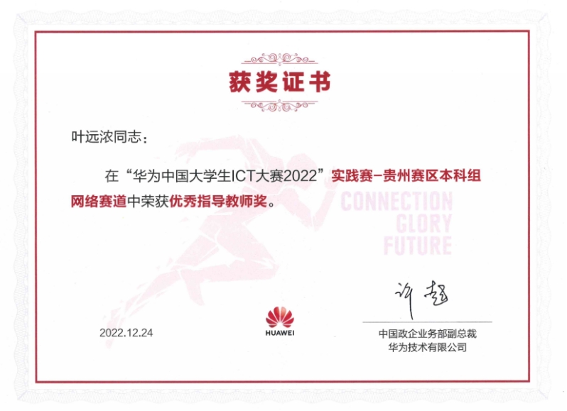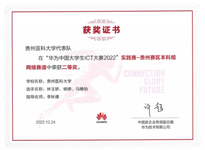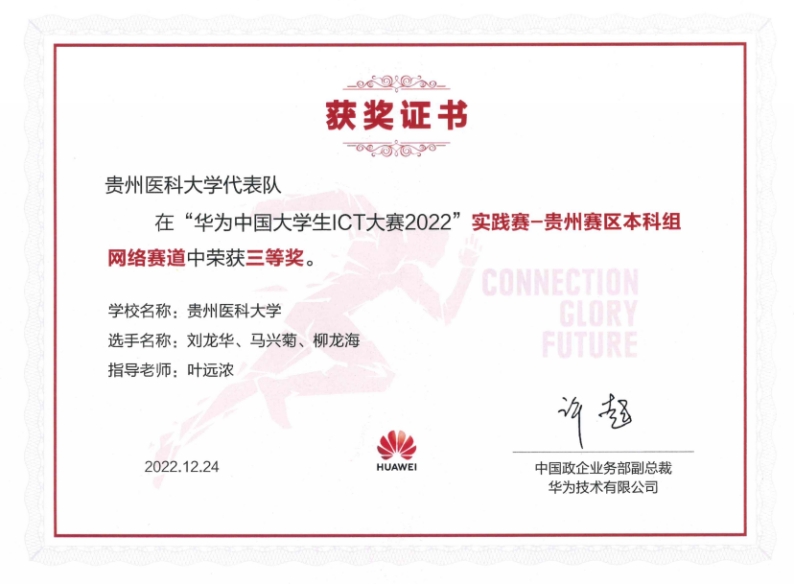 近日,华为ICT大赛2022-2023贵州省实践赛决赛顺利结束,太阳成学生首次参赛并喜获佳绩。其中,生物与工程学院(健康医药现代产业学院)学生林玉娇、杨婷和马椿怡获得本科组网络赛道二等奖,大健康学院学生刘龙华、马兴菊和柳龙海获本科组网络赛道三等奖。李秋德、叶远浓获优秀指导教师奖。