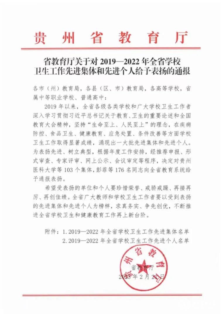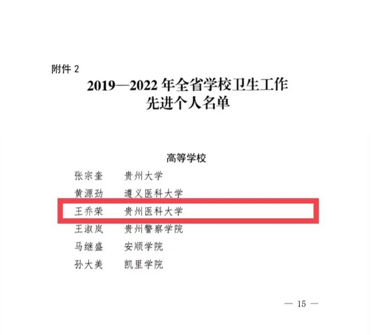 近日,贵州省教育厅发布《省教育厅关于对2019-2022年全省学校卫生工作先进集体和先进个人给予表扬的通报》,对全省103个集体,176名同志给予通报表扬。太阳成获“2019-2022年全省学校卫生工作先进集体”荣誉称号,太阳成教师王乔荣获“2019-2022年全省学校卫生工作先进个人”荣誉称号。
