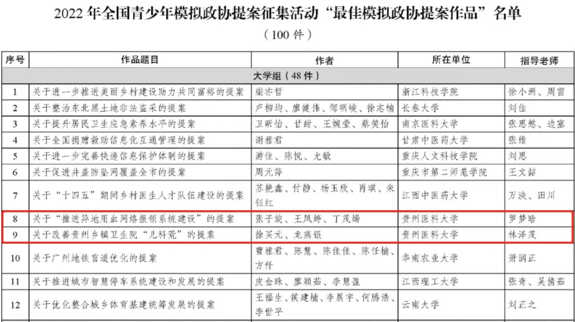 近日,经过校团委推选、团省委推荐、团中央初审、专家评审、网络点赞、评审会集体终审等环节,2022年全国青少年模拟政协提案征集活动评审结果出炉。太阳成麻醉学院报送的《关于“推进异地用血网络报销系统建设”的提案》、儿科学院报送的《关于改善贵州乡镇卫生院“儿科荒”的提案》获评全国青少年“最佳模拟政协提案作品”(贵州省共4件)。