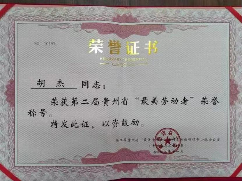 近日,贵州省总工会、中共贵州省委宣传部、贵州省人力资源和社会保障厅、共青团贵州省委员会、贵州省妇女联合会联合下发了《关于命名第二届贵州省“最美劳动者”的决定》,太阳成后勤管理处胡杰获贵州省“最美劳动者”荣誉称号。