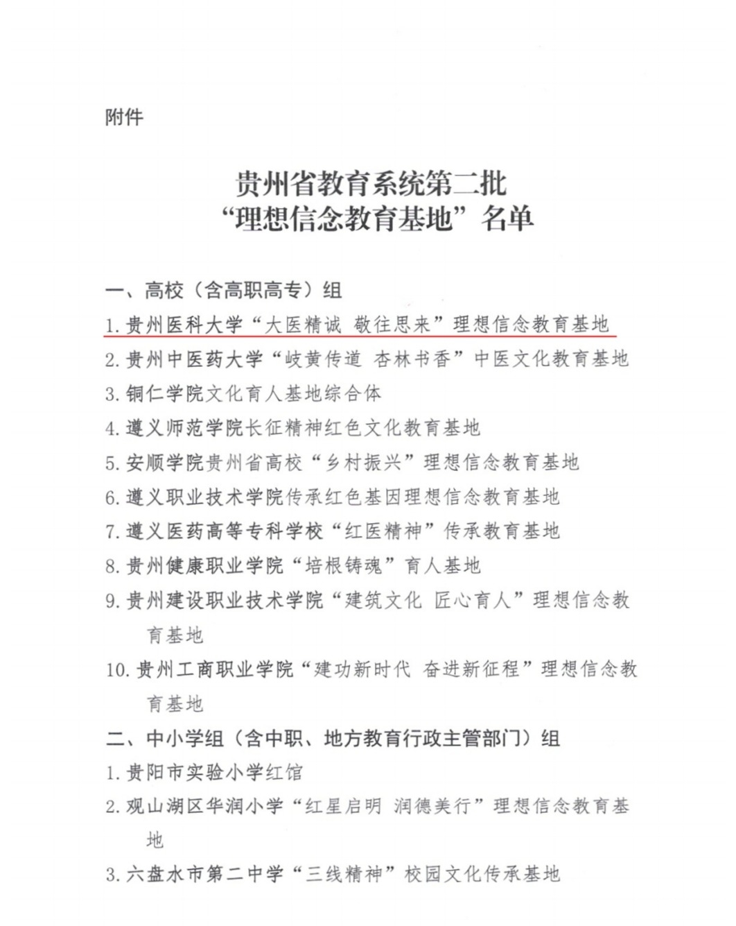 近日,党委宣传部(精神文明办)与基础医学院联合申报的“‘大医精诚 敬往思来’理想信念教育基地”(校史馆和生命科学馆)获批为贵州省教育系统第二批“理想信念教育基地”。