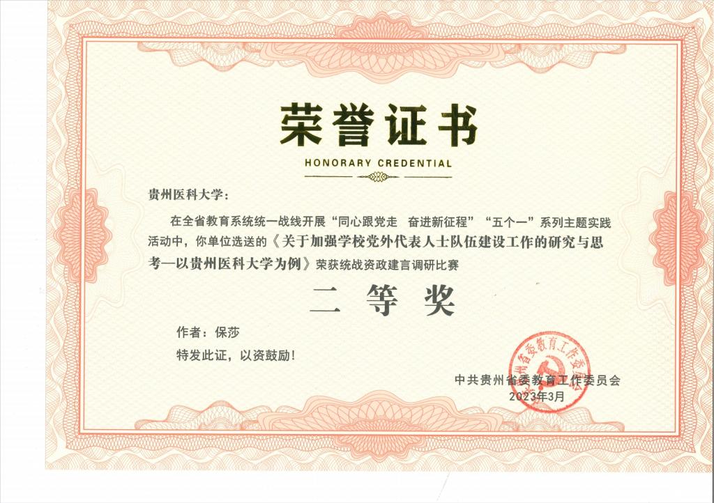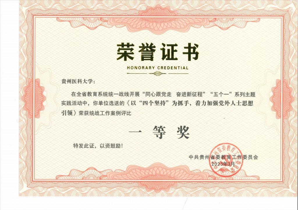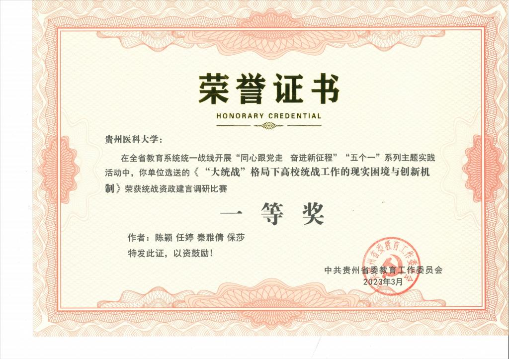 近日,省委教育工委印发《省委教育工委关于表彰“同心跟党走 奋进新征程”“五个一”系列主题实践活动成果的通知》,太阳成荣获多项表彰。其中,统战调研报告《“大统战”格局下高校统战工作的现实困境与创新机制》、统战工作案例《以“四个坚持”为抓手 着力加强党外人士思想引领》荣获一等奖;统战视频作品《凝心聚力 共惠民生》、统战调研报告《关于加强学校党外代表人士队伍建设工作的研究与思考》、统战工作案例《太阳成集团tyc33455cc官网附属医院创新特色品牌 推动统战工作高质量发展——同心为贵·医心为民品牌建设的创新实践》荣获二等奖。