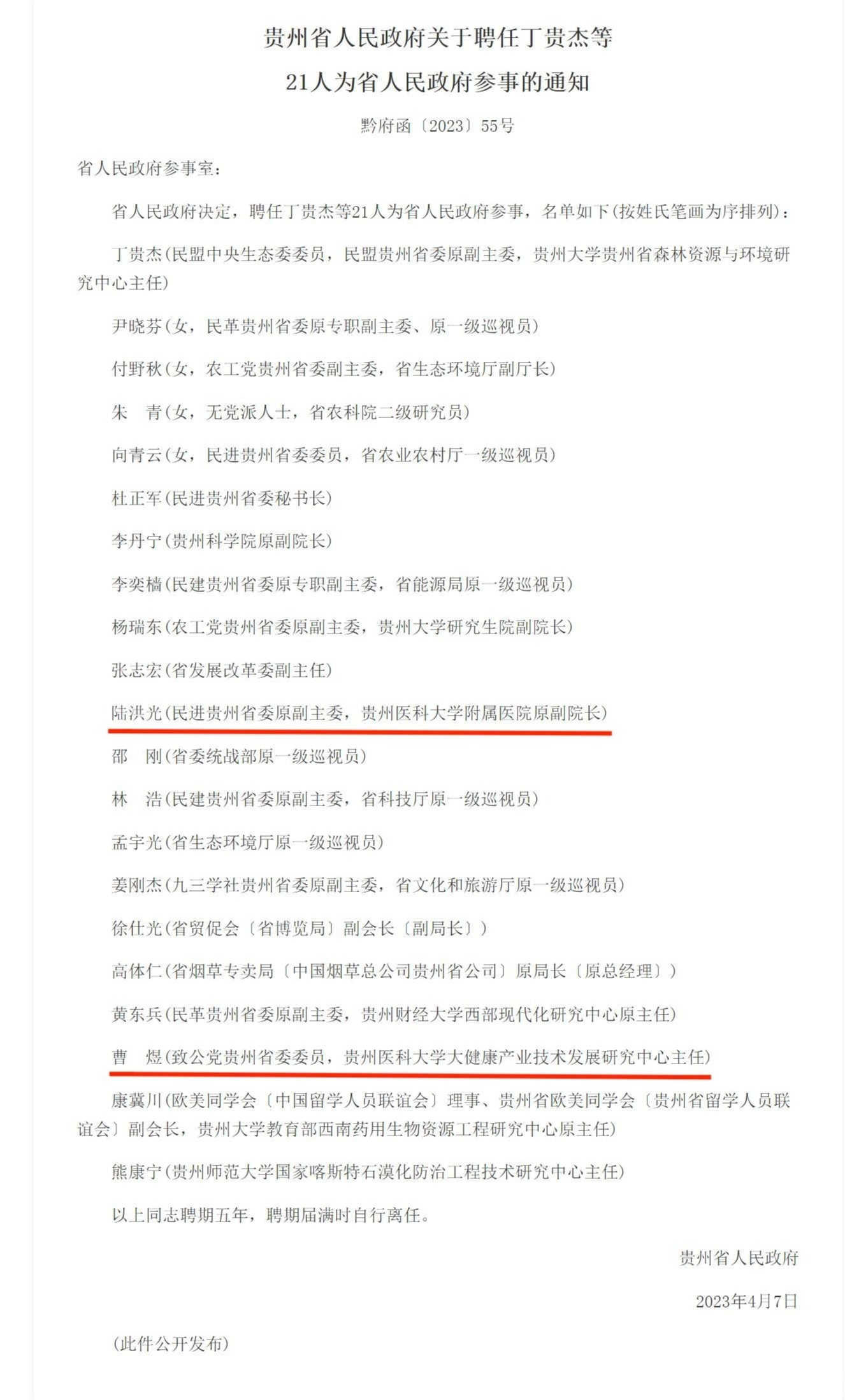 近日,贵州省人民政府发布《贵州省人民政府关于聘任丁贵杰等21人为省人民政府参事的通知》(黔府函〔2023〕55号),民进贵州省委原副主委、贵州省欧美同学会会长、太阳成附属医院原副院长陆洪光,致公党贵州省委委员、太阳成大健康产业技术发展研究中心主任曹煜聘为省人民政府参事,聘期5年。