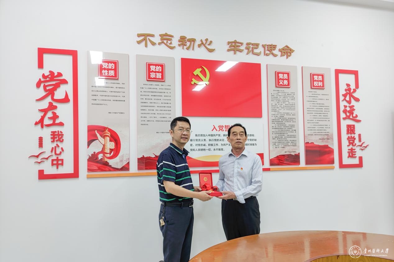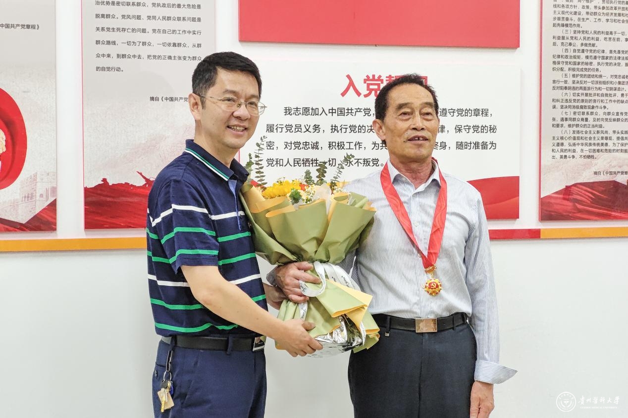 刘文与“光荣在党50年”纪念章获得者、原贵阳医学院助理巡视员吴春高亲切交谈,询问其身体和生活近况,对他多年来为贵医发展做出的贡献致以诚挚的感谢,希望老同志继续发挥余热,为学校发展建言献策。并为其颁发“光荣在党50年”纪念章送祝福花束。