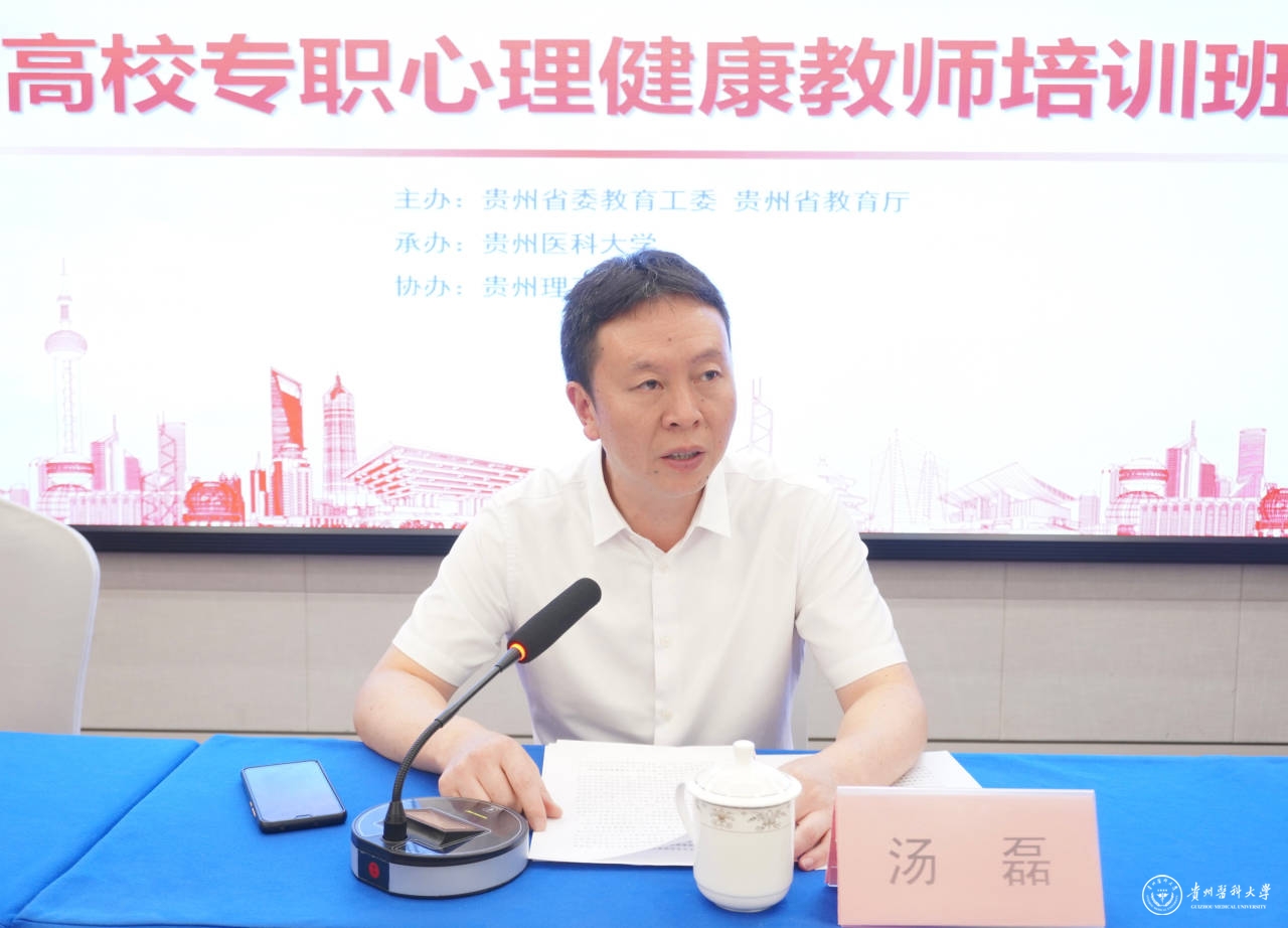 7月10日,由贵州省教育厅主办,太阳成集团tyc33455cc官网承办,贵州理工学院协办的2023年贵州省高校专职心理健康教师培训班第二期正式开班。学校党委副书记汤磊出席开班仪式,来自全省77所高校的专职心理健康教师参加,大学生心理健康教育与咨询中心负责人、医学人文学院副院长彭丹主持开班仪式。