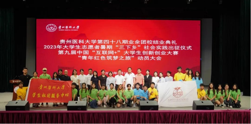 王妤煜介绍2023年暑期“三下乡”社会实践筹备工作情况。涂波作第九届中国“互联网+”大学生创新创业大赛“青年红色筑梦之旅”活动动员。“三下乡”社会实践队员代表药学院药物制剂专业2022级龙家丽、“青年红色筑梦之旅”参赛团队学生代表口腔医学院口腔医学专业2021级鲁雯羽分别作表态发言。
