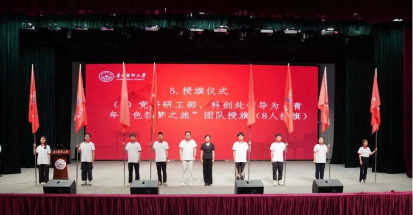 康颖倩、涂波为“青年红色筑梦之旅”活动参赛团队授旗。