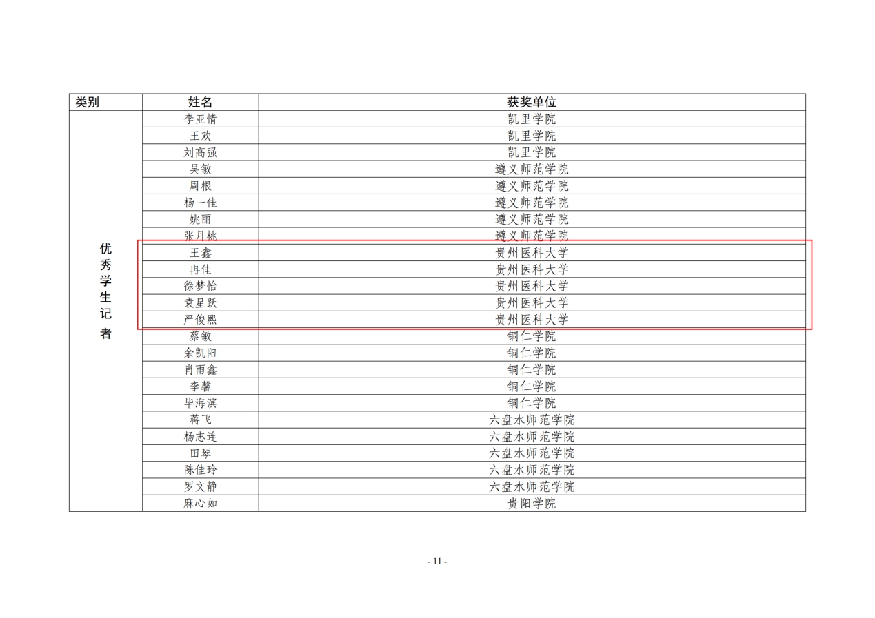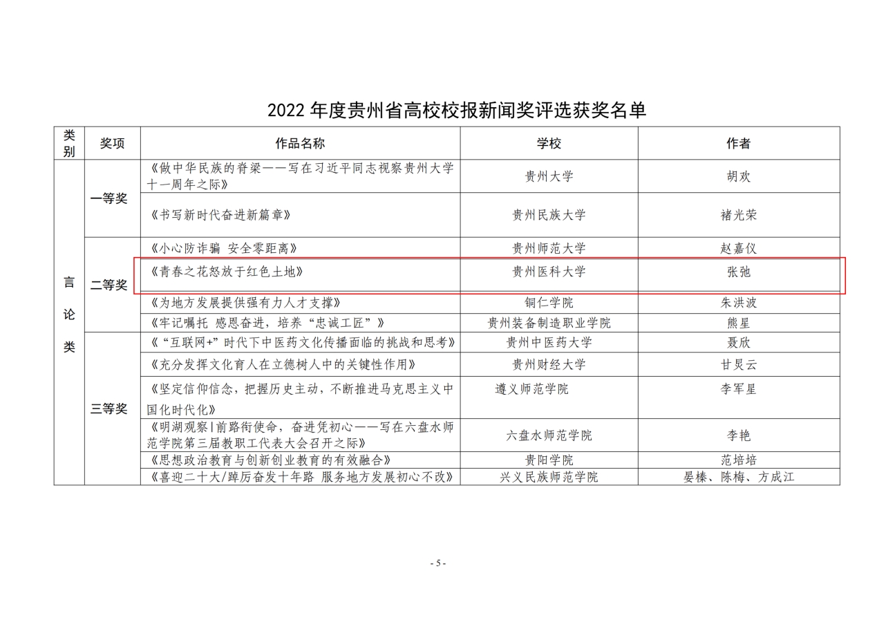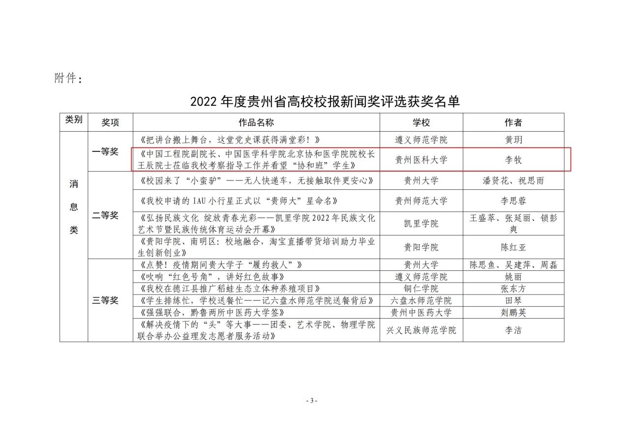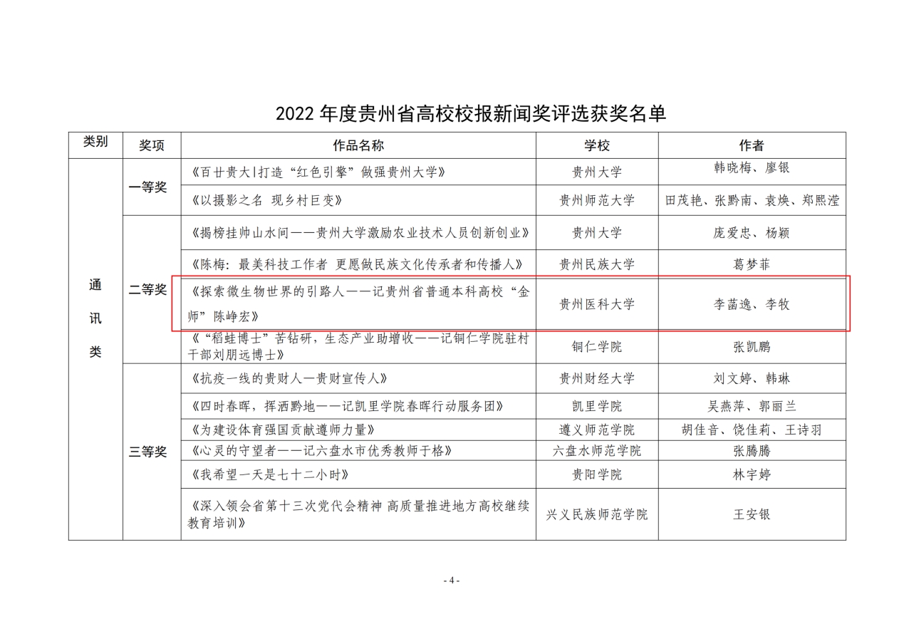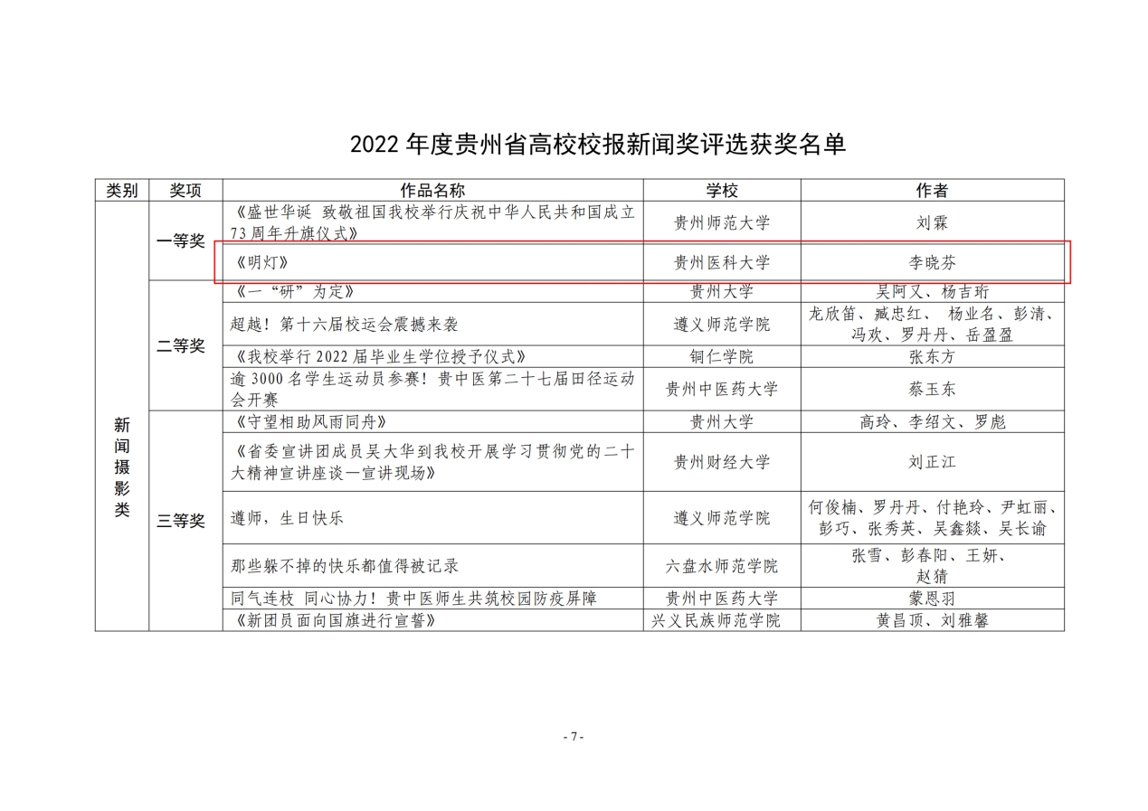 李牧《中国工程院副院长、中国医学科学院北京协和医学院院校长王辰院士莅临太阳成考察指导工作并看望“协和班”学生》获消息类一等奖,李晓芬《明灯》获新闻摄影类一等奖;李菡逸、李牧《探索微生物世界的引路人——记贵州省普通本科高校“金师”陈峥宏》获通讯类二等奖,张弛《青春之花怒放于红色土地》获言论类二等奖;田珊、汪彤、韦忠玉、田芷蕊《太阳成集团tyc33455cc官网报2022年9月30日第3版》获版面类三等奖;王鑫、冉佳、徐梦怡、袁星跃、严俊熙获“优秀学生记者”称号。