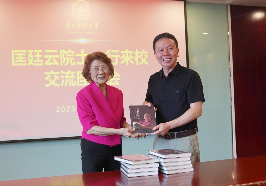 匡廷云院士向学校捐赠了汤佩松先生所著书籍《为接朝霞顾夕阳——一位生理学科学家的回忆录》,汤磊代表学校向匡廷云院士赠送贵医文创产品。