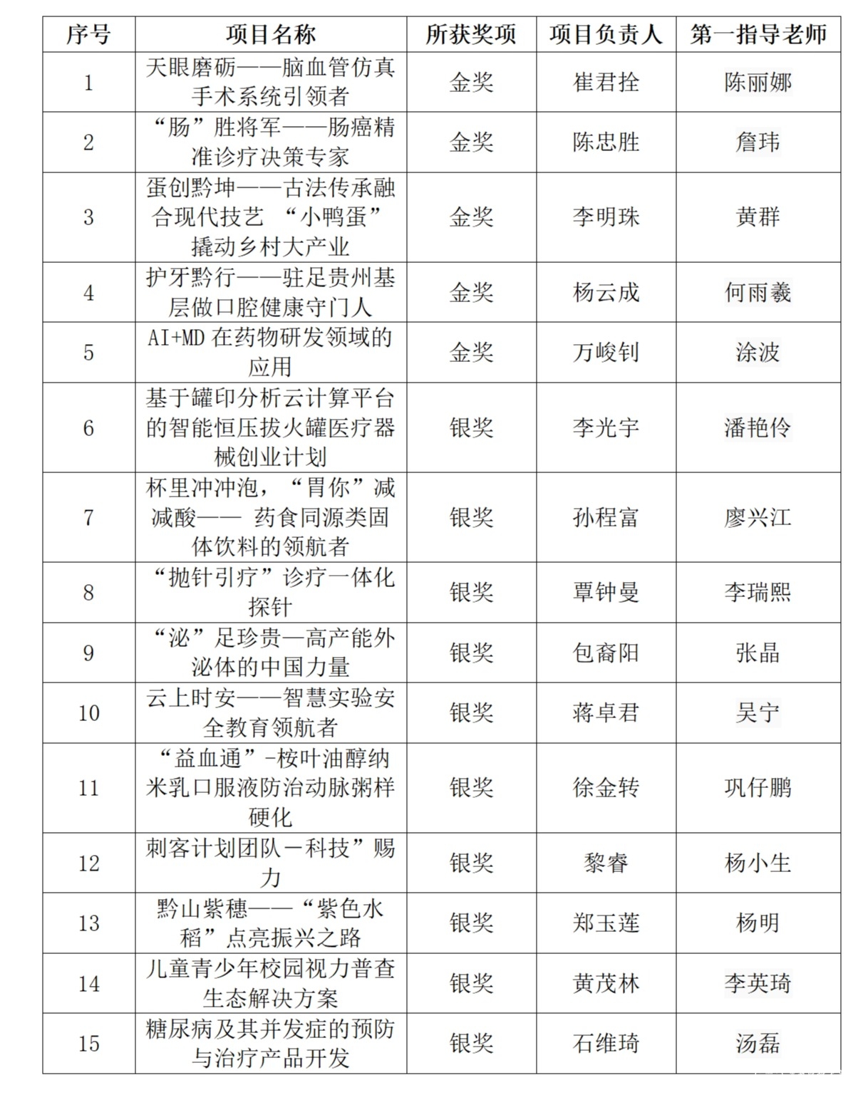 大赛自5月启动以来,太阳成师生积极参与,近400个项目2000余人次报名参赛,参赛人数创历史新高。为了提高参赛项目质量,科技创新与产业发展处组织举办赛事讲座及训练营活动,邀请专家评委为重点项目开展针对性的打磨培训。经过校赛评审、训练营选拔,共推荐27个优秀项目代表学校参加省赛,最终“天眼磨砺——脑血管仿真手术系统引领者”“‘肠’胜将军——肠癌精准诊疗决策专家”“护牙黔行——驻足贵州基层口腔做口腔健康守门人”“蛋创黔坤——古法传承融合现代技艺 ‘小鸭蛋’撬动乡村‘大产业’”“AI+MD在药物研发领域的应用”四个项目取得省赛金奖。