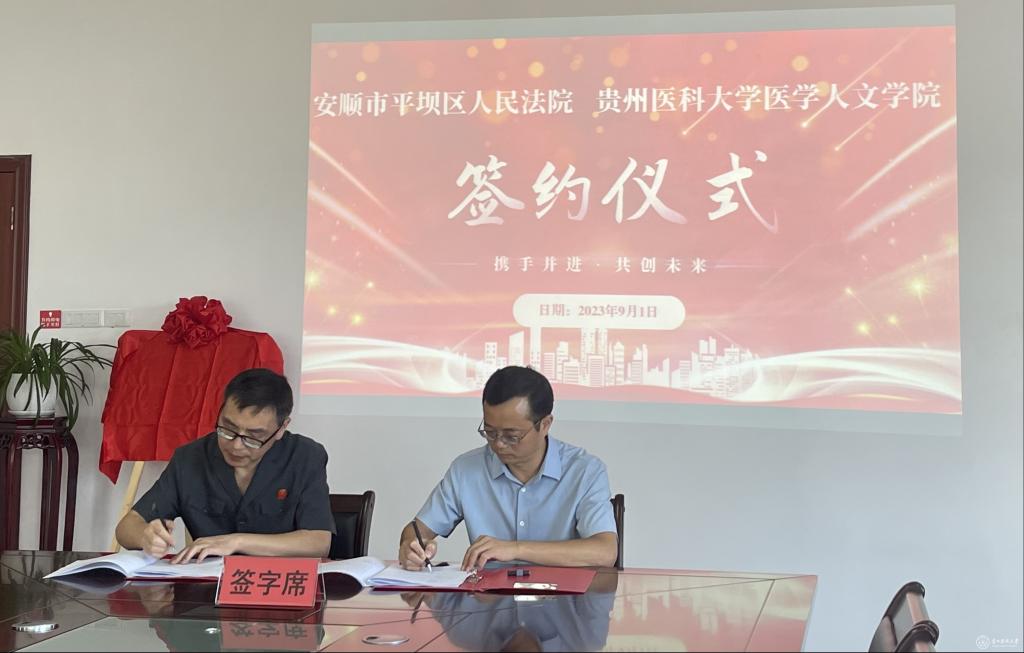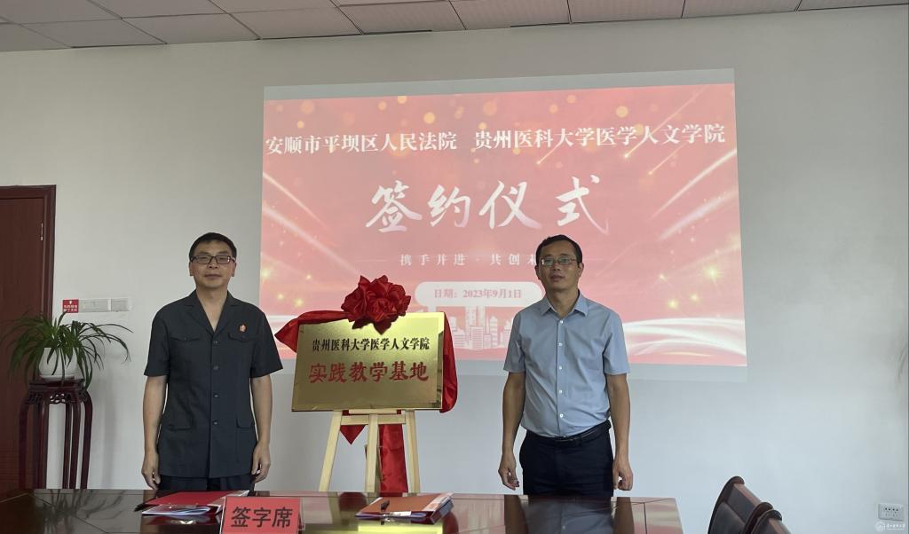 江宣成代表医学人文学院、肖帮华代表平坝区人民法院签订《安顺市平坝区人民法院太阳成集团tyc33455cc官网医学人文学院全面合作框架协议》《安顺市平坝区人民法院太阳成集团tyc33455cc官网医学人文学院共建人才培养基地协议书》,并揭牌实践教学基地。