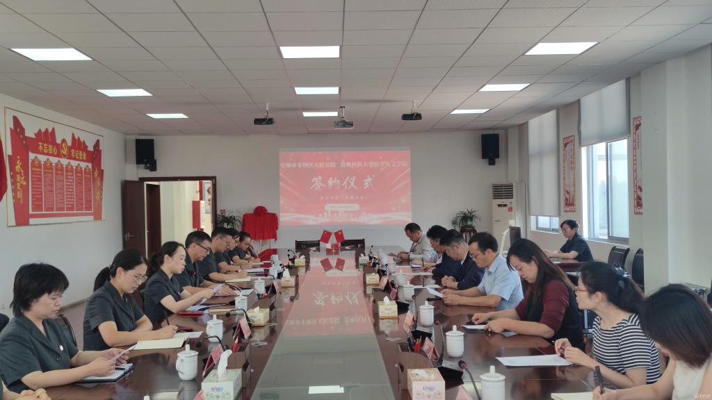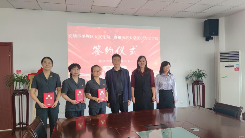9月1日,医学人文学院与安顺市平坝区人民法院举行全面合作及实践教学基地签约授牌仪式。校党委副书记刘文出席,医学人文学院党委书记江宣成、正处级组织员韩贞习、学院党委副书记兼纪委书记张贤、大学生心理健康教育与咨询中心副主任兼医学人文学院副院长彭丹及相关人员参加,平坝区人民法院党组书记、院长肖帮华,党组副书记、常务副院长李华夏,党组成员、政治部主任肖果及有关人员参加。