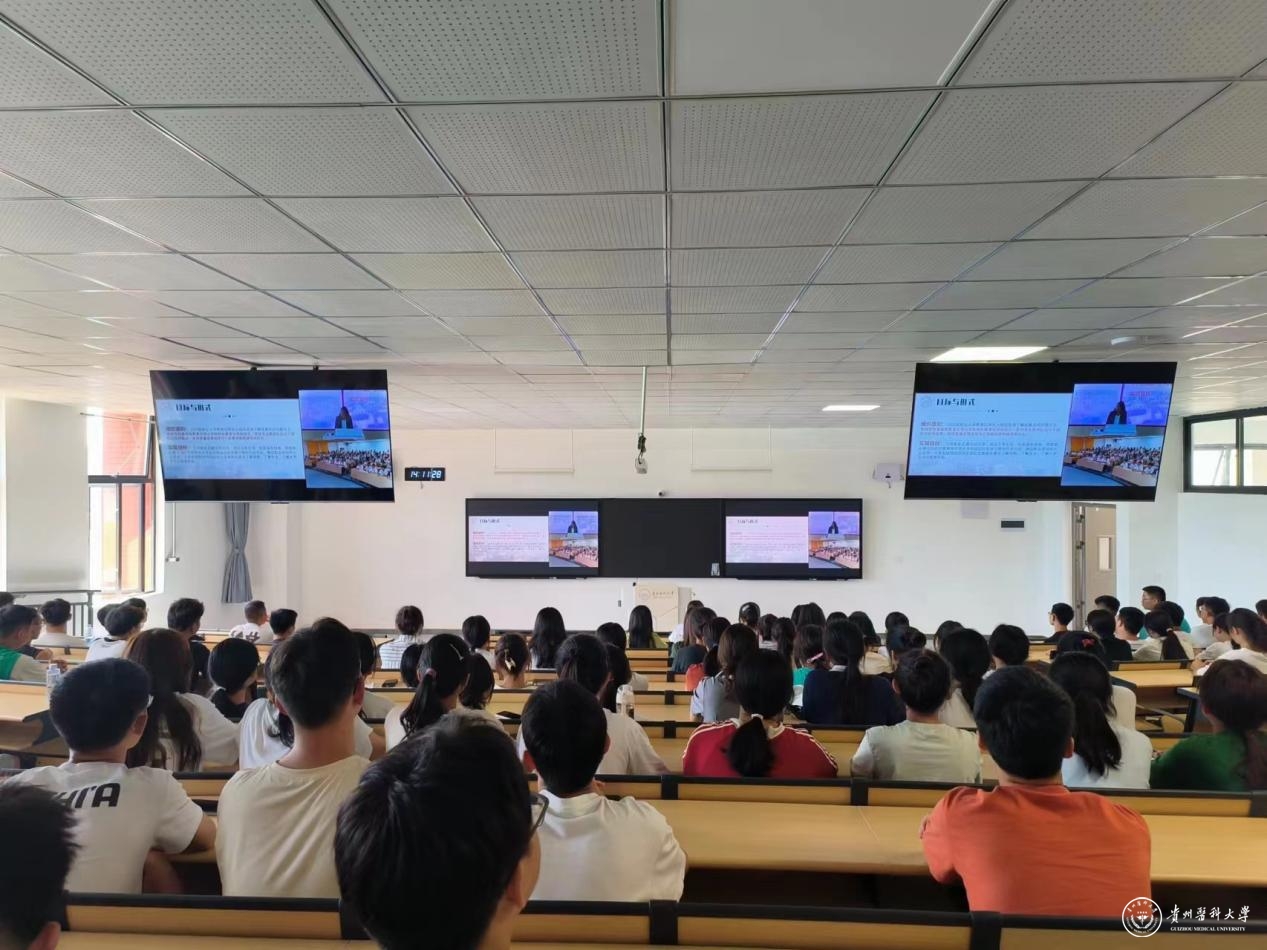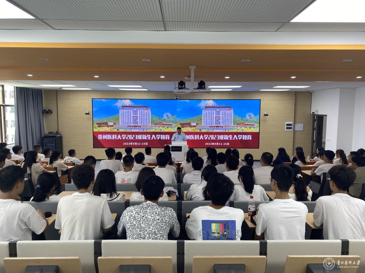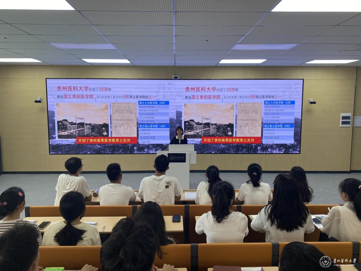 校党委委员、党委宣传部(精神文明办)部长(主任)、党委统战部部长陈颖以《传承贵医校史,弘扬贵医文化》为题,为同学们带来了一堂生动的爱校荣校教育课,从太阳成的历史沿革、发展概况、贵医文化等角度,向新生全面介绍学校的悠久历史和辉煌成就。