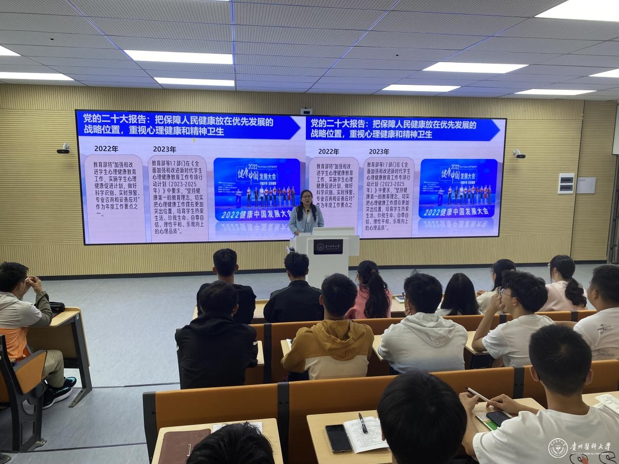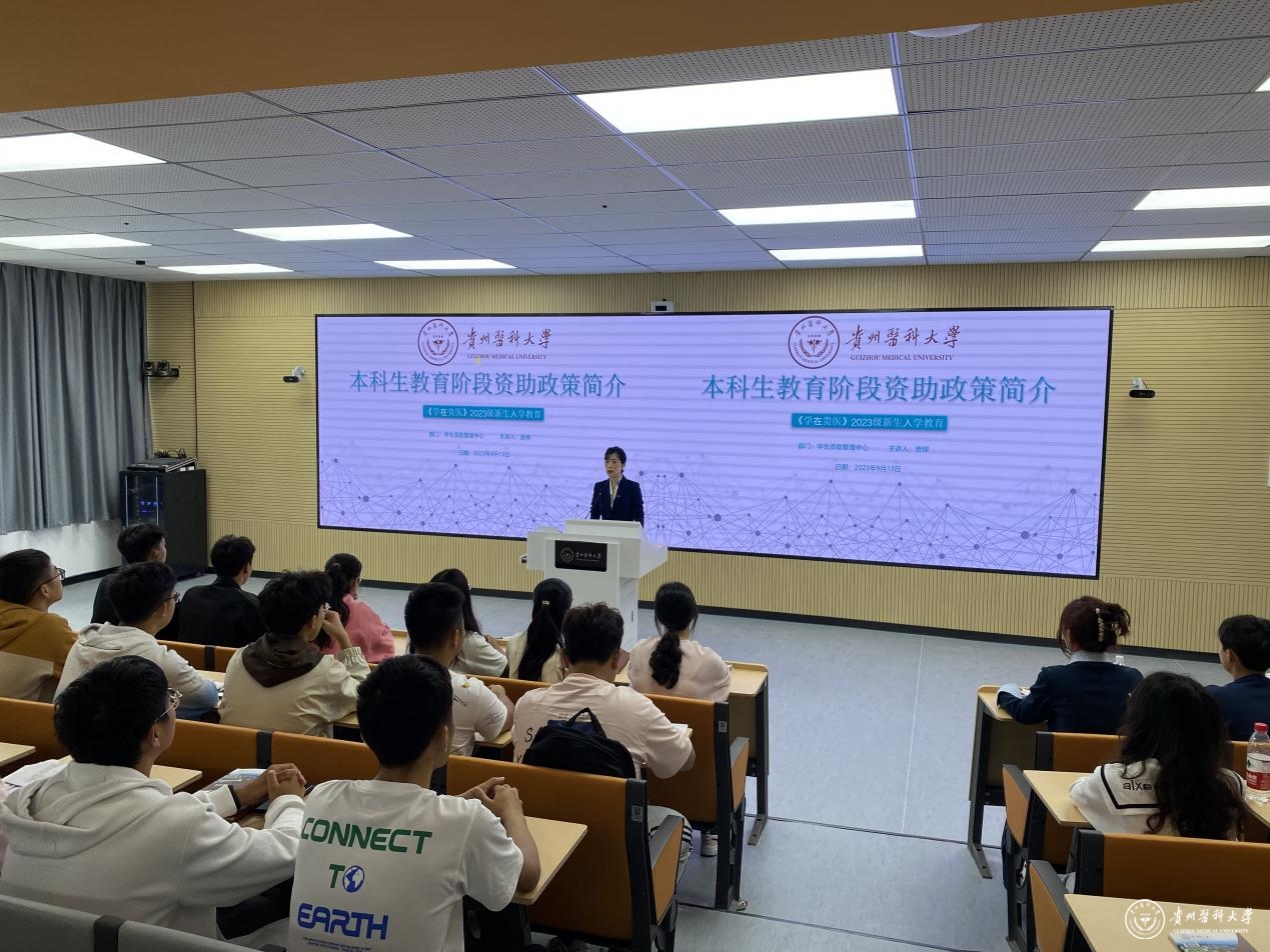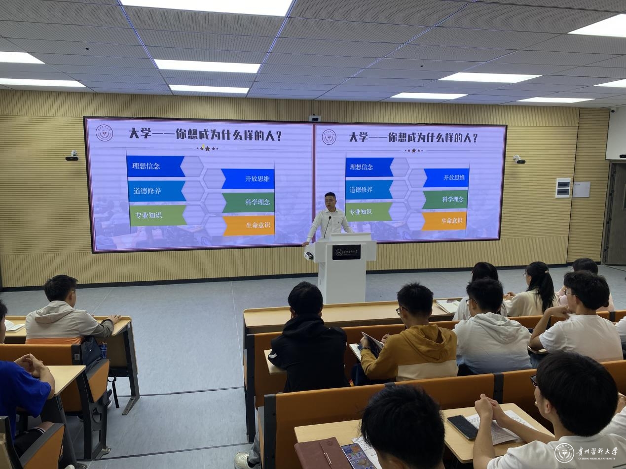 校党委委员、党委宣传部(精神文明办)部长(主任)、党委统战部部长陈颖以《传承贵医校史,弘扬贵医文化》为题,为同学们带来了一堂生动的爱校荣校教育课,从太阳成的历史沿革、发展概况、贵医文化等角度,向新生全面介绍学校的悠久历史和辉煌成就。