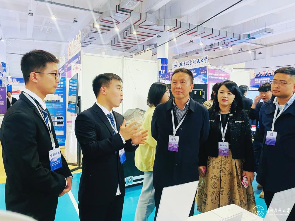 在“挑战杯”项目巡展展厅,汤磊观看了太阳成项目展台,听取参赛选手对项目的介绍,并对选手作现场指导。他向进入全国决赛的参赛选手和指导老师表示祝贺。他表示,学校高度重视大学生创新创业工作,近年来在各类比赛中的获奖层次和获奖数量都取得了很大的进步,学校师生参与“挑战杯”等学科竞赛的热情不断升温,科技创新氛围日益浓厚,希望参与这次“挑战杯”终审的各位参赛选手放平心态、沉着应战,在比赛中充分展示贵医青年蓬勃向上、勇于拼搏的精神风貌,力争取得更好成绩。汤磊还看望了服务本次终审决赛的志愿者及教师代表。