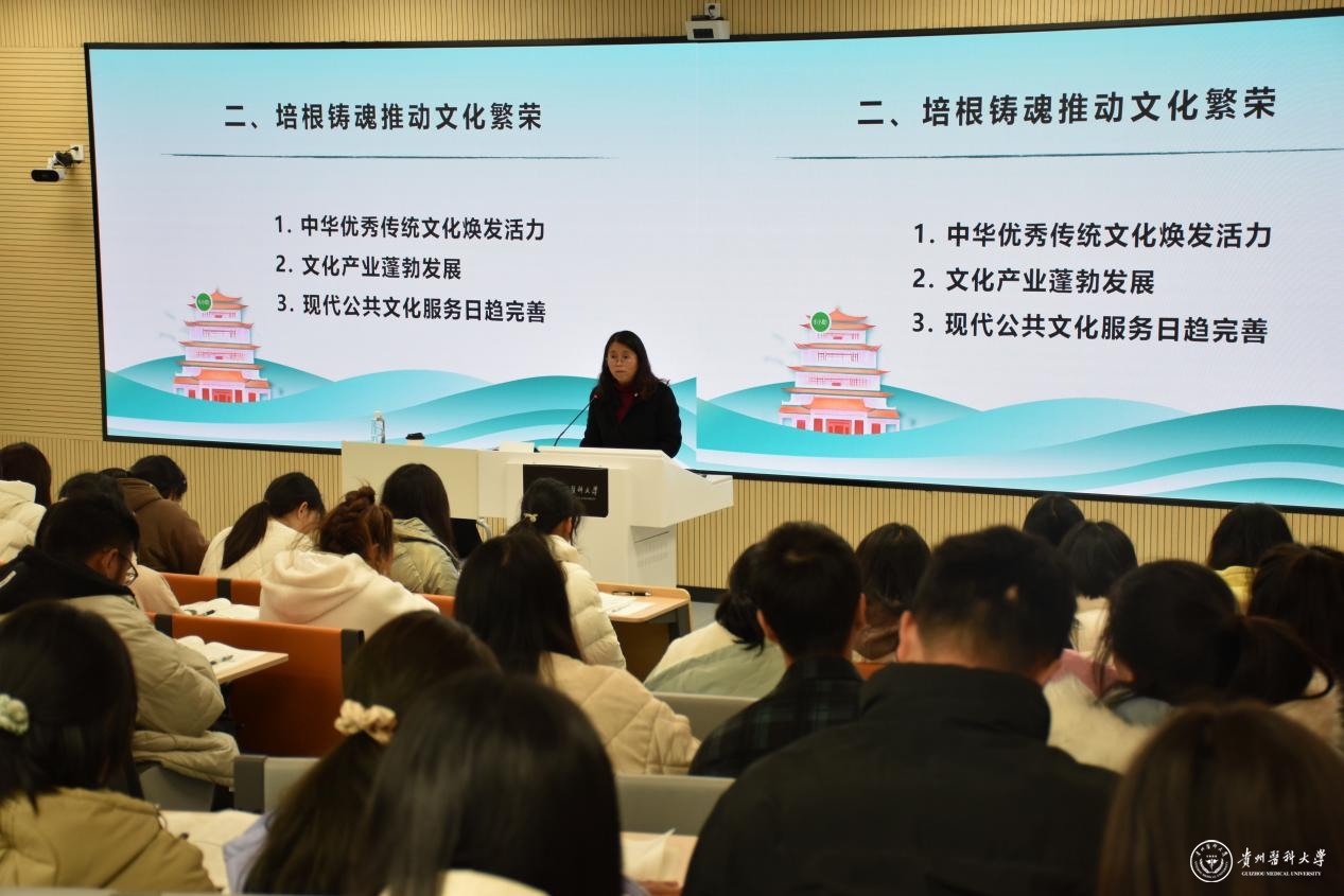 蒋红梅围绕“历史悠久缔造中华文化”“培根铸魂推动文化繁荣”“笃定前行建设现代文明”三个方面,阐释中华文明连续性、创新性、统一性、包容性、和平性等五大突出特性。用数字化文化产品、文化新业态案例引导学生感悟党的十八大以来,中华传统文化焕发新活力、文化产业蓬勃发展、现代公共文化服务日趋完善的伟大成就。