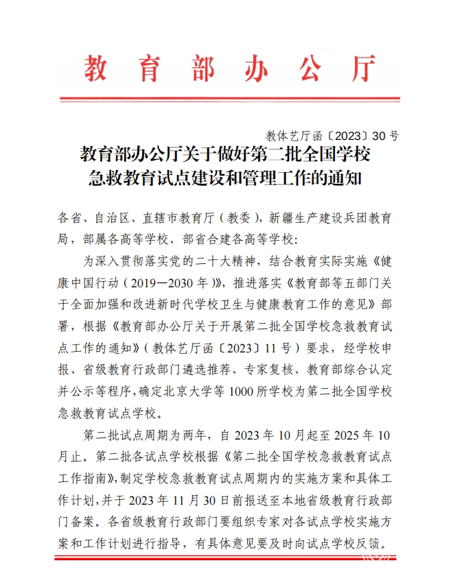 近日,教育部办公厅下发《关于做好第二批全国学校急救教育试点建设和管理工作的通知》文件,公布了《第二批全国学校急救教育试点学校名单》,太阳成获批“全国学校急救教育试点学校”。