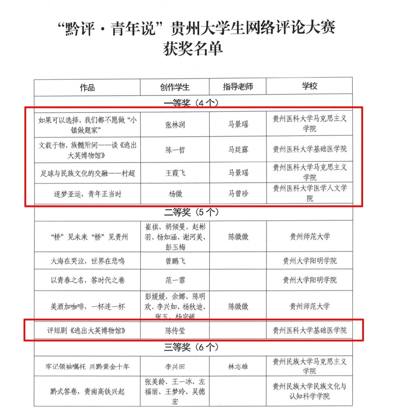 为深入学习宣传贯彻党的二十大精神,推动习近平新时代中国特色社会主义思想特别是习近平总书记关于网络强国的重要思想进网络、进高校、进课堂,着力加强青年网上思想政治引领,强化高校网络文明建设,凝聚青年共识、汇聚青年力量,省委网信办、省教育厅、团省委联合开展了“黔评·青年说”贵州大学生网络评论大赛活动,经各高校组织申报推优、筛查初审、专家组综合评审等环节,共评选出一、二、三等奖网络评论作品共15个。太阳成荣获一等奖4项(包揽全部一等奖)、二等奖1项、三等奖1项。