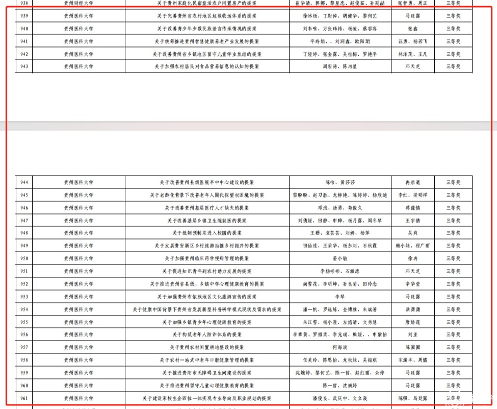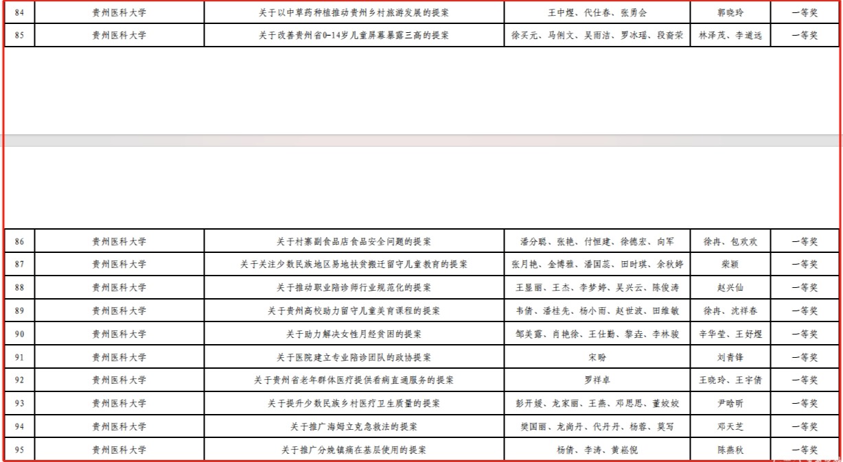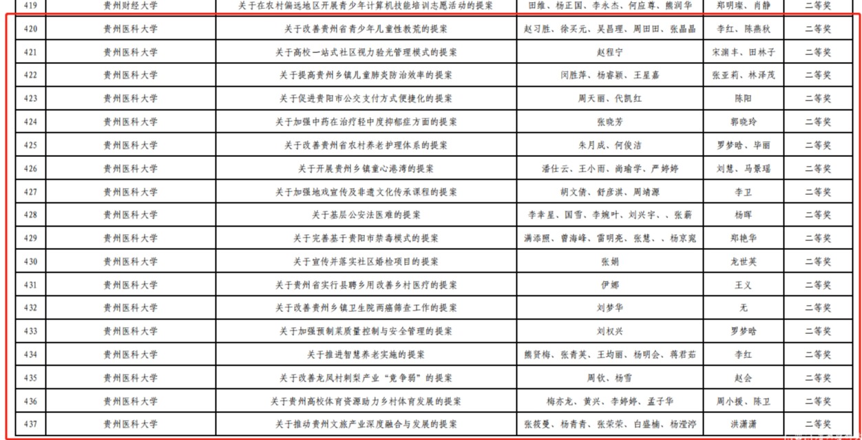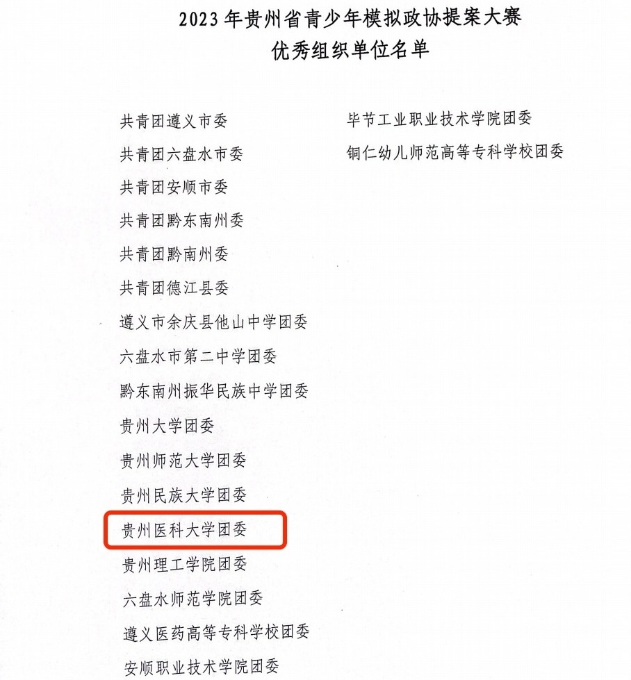 近日,团省委、贵州省政协提案委、省学联联合下发了《关于公布2023年贵州省青少年模拟政协提案大赛评选结果的通报》,“太阳成集团tyc33455cc官网团委”被评为“优秀组织单位”,药学院“关于以中草药种植推动贵州乡村旅游发展的提案”等12个作品被评为“一等奖”,麻醉学院“关于改善贵州省青少年儿童性教荒的提案”等18个作品被评为“二等奖”,基础医学院“关于完善贵州省农村地区垃圾收运体系的提案”等23个作品被评为“三等奖”。