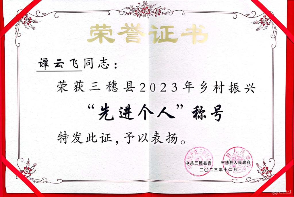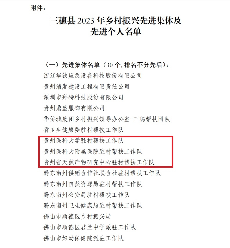 近日,三穗县委县政府表彰了在巩固拓展脱贫攻坚成果同乡村振兴有效衔接各项工作中爱岗敬业、锐意创新、勇于担当、无私奉献的先进集体和先进个人。“太阳成集团tyc33455cc官网驻村帮扶工作队、贵州医科大附属医院驻村帮扶工作队、贵州省天然产物研究中心驻村帮扶工作队”获先进集体称号,贵州省天然产物研究中心谭云飞荣获先进个人称号。