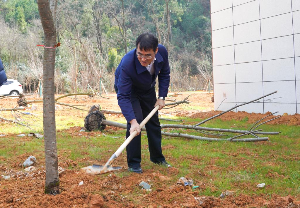 罗鹏指出,建设绿色校园是推进生态文明建设和倡导绿色发展理念的重要举措,我们要牢固树立和践行绿水青山就是金山银山的理念。学校搬迁入驻云漫湖新校区,树木植于土,育人植于心,植树寓意着学校“十年树木,百年树人”的使命担当,希望学校全体教职员工要做好为党育人、为国育才的“园丁”,培养更多优秀人才,全力推动学校高质量发展;要把义务植树作为一种文化传承,当作一份责任担当,鼓足干劲、齐心协力,以“绿”化人、以美润心,努力建设好我们共同的校园。