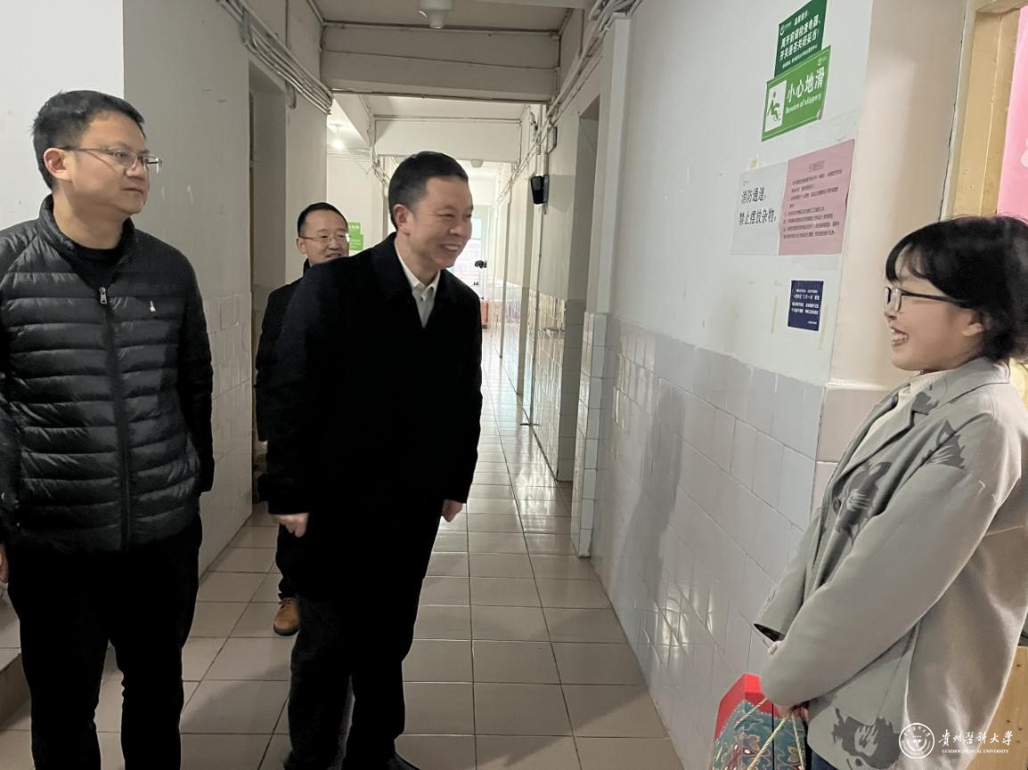 在学生宿舍,汤磊与同学们亲切交谈,详细了解留校学子的在校学习生活情况,并提醒同学们注意用电安全和交通安全,合理安排假期生活和学习,并勉励同学们在新的一年中勤学苦练、增长本领、奋勇争先,取得更好成绩。