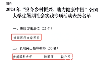 为深入学习宣传贯彻习近平新时代中国特色社会主义思想,贯彻落实习近平总书记关于青年工作的重要思想,动员广大医药类高校学生投身乡村振兴、健康中国战略,团中央青年发展部组织开展2023年“投身乡村振兴,助力健康中国”全国大学生暑期社会实践专项活动。近期,团中央青年发展部对表现突出的实践单位、团队和个人提出表扬,太阳成团委获得“全国表现突出单位”,基础医学院陈圆圆获得“表现突出指导老师”。