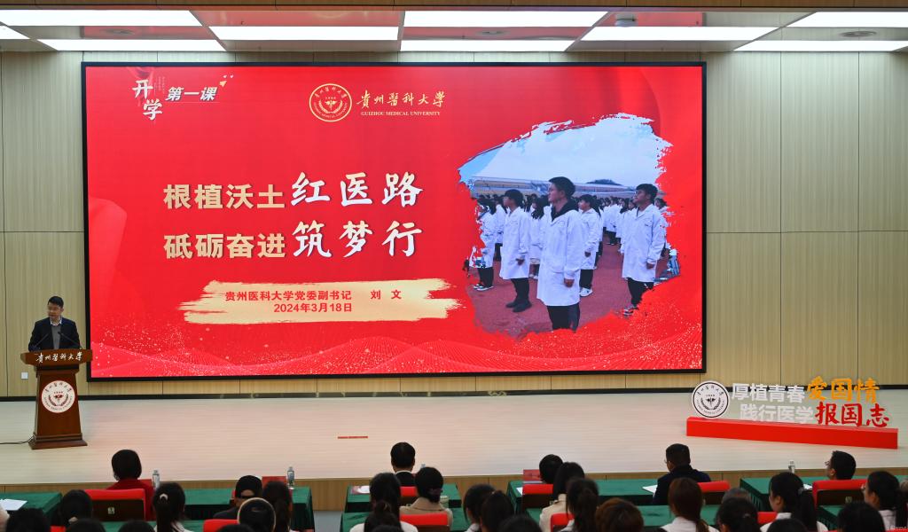 刘文以《根植沃土红医路 砥砺奋进筑梦行》为题,以贵医心怀国之大者的前辈大师及练就过硬本领的师兄师姐的故事为例,激励同学们把握大学时光,激荡新气象,实现新突破,将爱国主义精神融入自我成长之中。