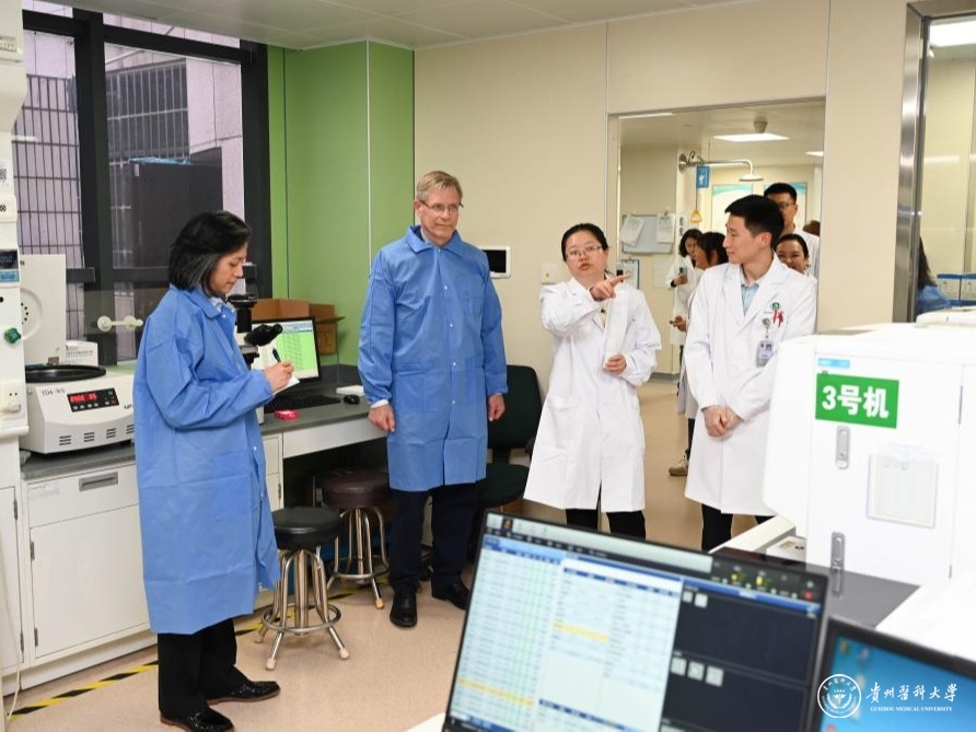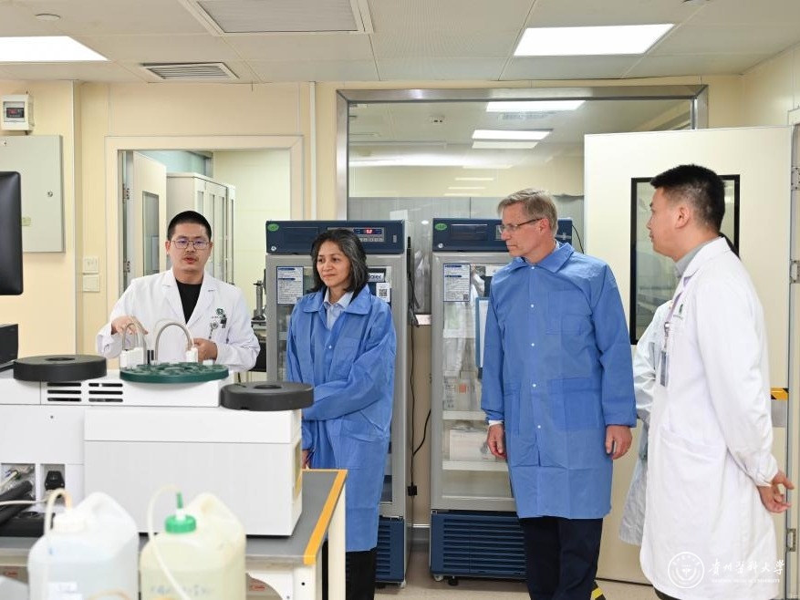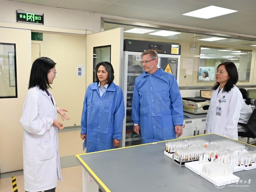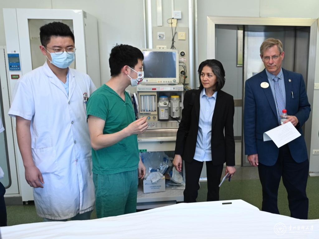 代表团参观附属医院医学检验中心和医学影像学院。他们在检验中心了解检验设备的配置、检验流程和技术水平等情况,并就深入合作细节进行交流。