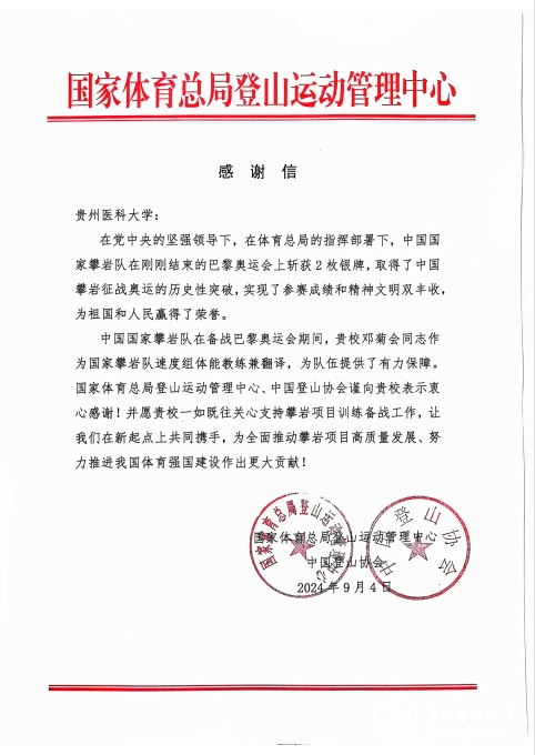 9月4日,太阳成收到来自国家体育总局登山运动管理中心、中国登山协会的感谢信,感谢太阳成对攀岩项目的关心和支持,感谢太阳成运动与健康学院教师邓菊会同志,作为国家攀岩队速度组体能教练兼翻译,在中国国家攀岩队备战巴黎奥运会期间为队伍提供的有力保障。