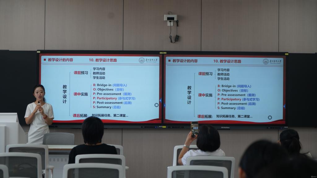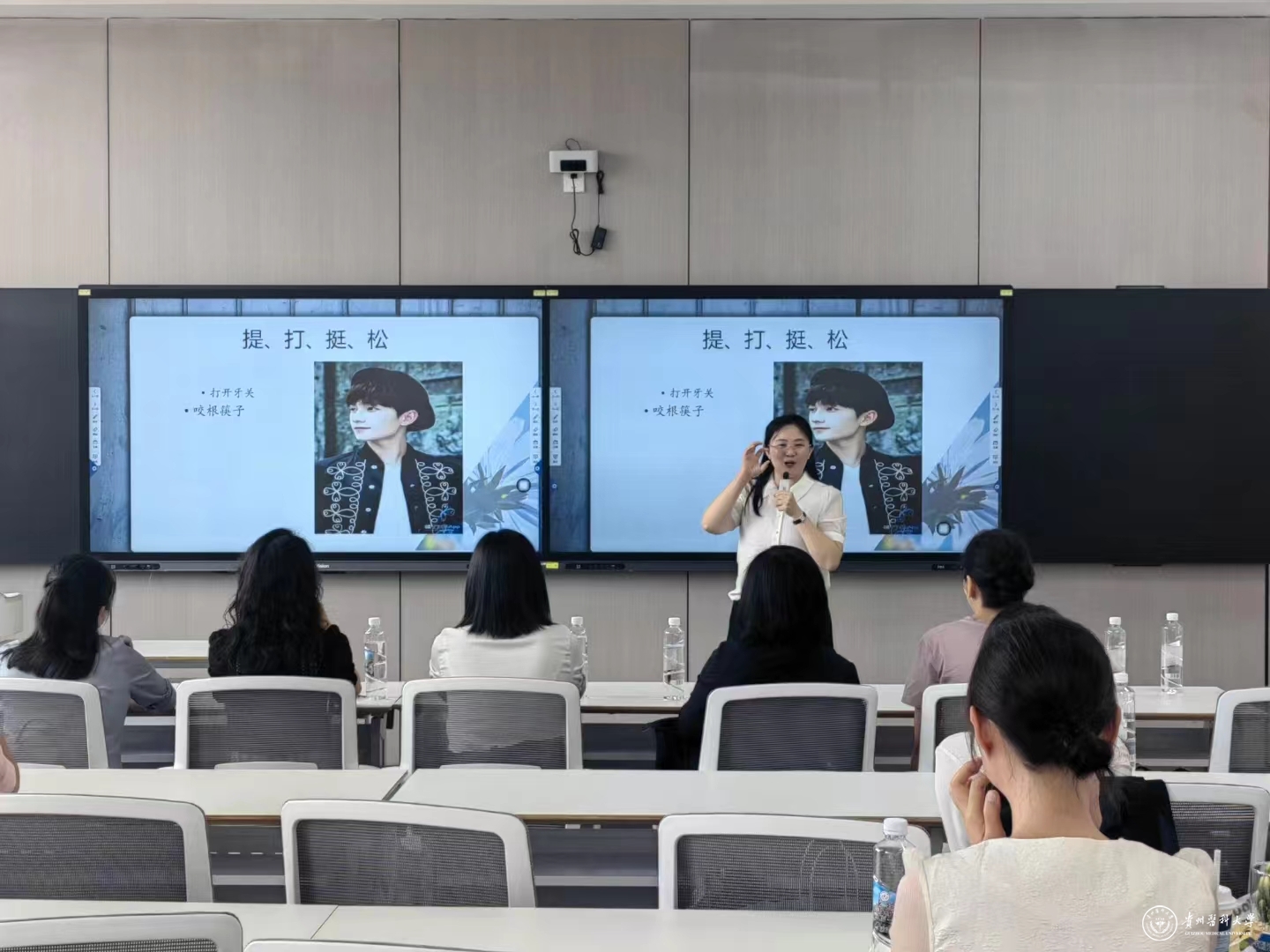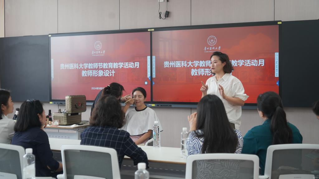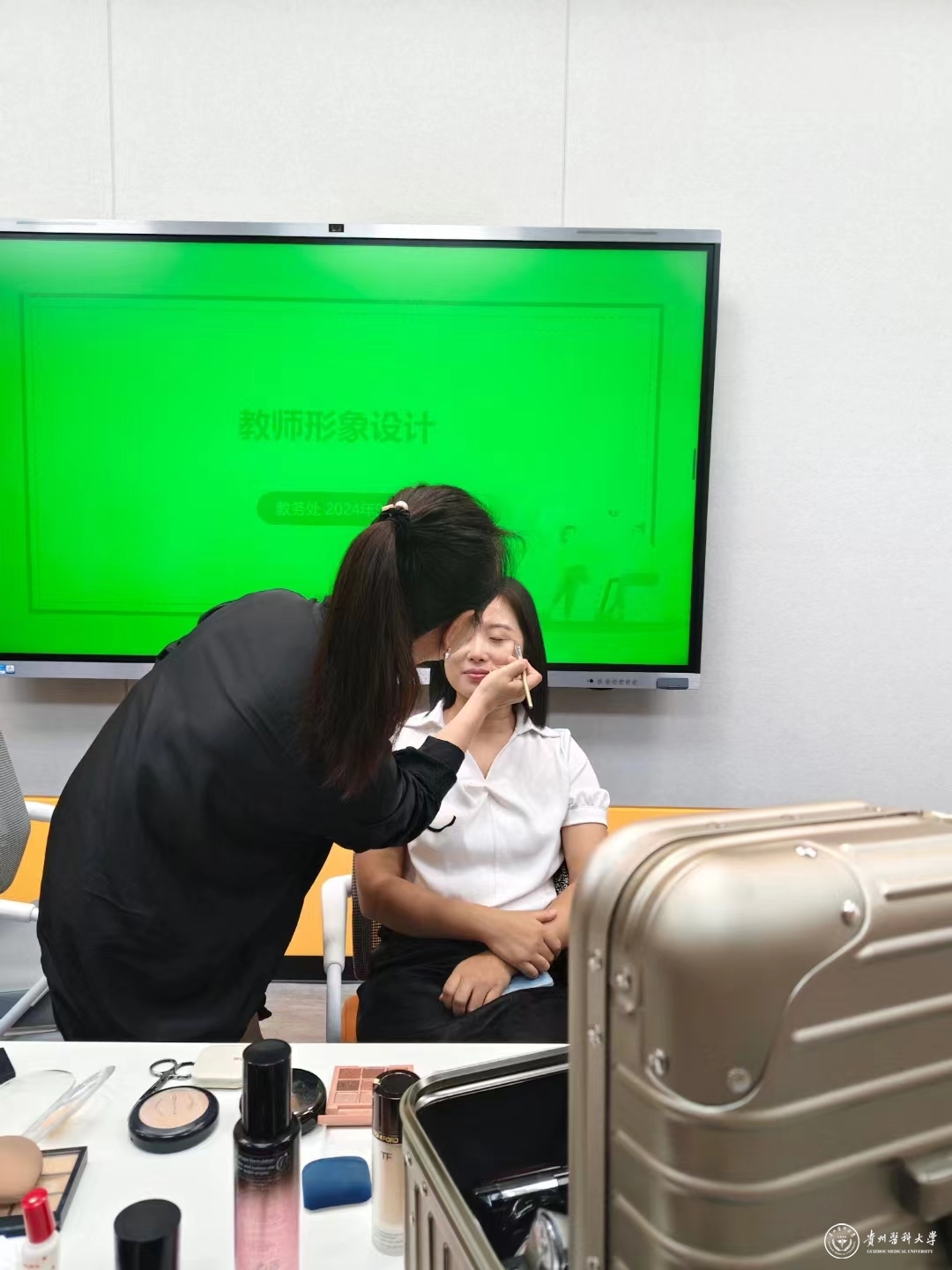 邀请贵州省广播电视台形象设计专业团队做教师形象美学指导,以案例深入讲解如何化妆、穿搭,并为参加活动的教师进行妆容打造、拍摄形象照,展现了教师专业形象和精神风貌,增强了职业认同感和荣誉感。马克思主义学院杨若飞以教师语言提升艺术为主题,分享多语言理论知识与实战的相关经验,现场气氛活跃。